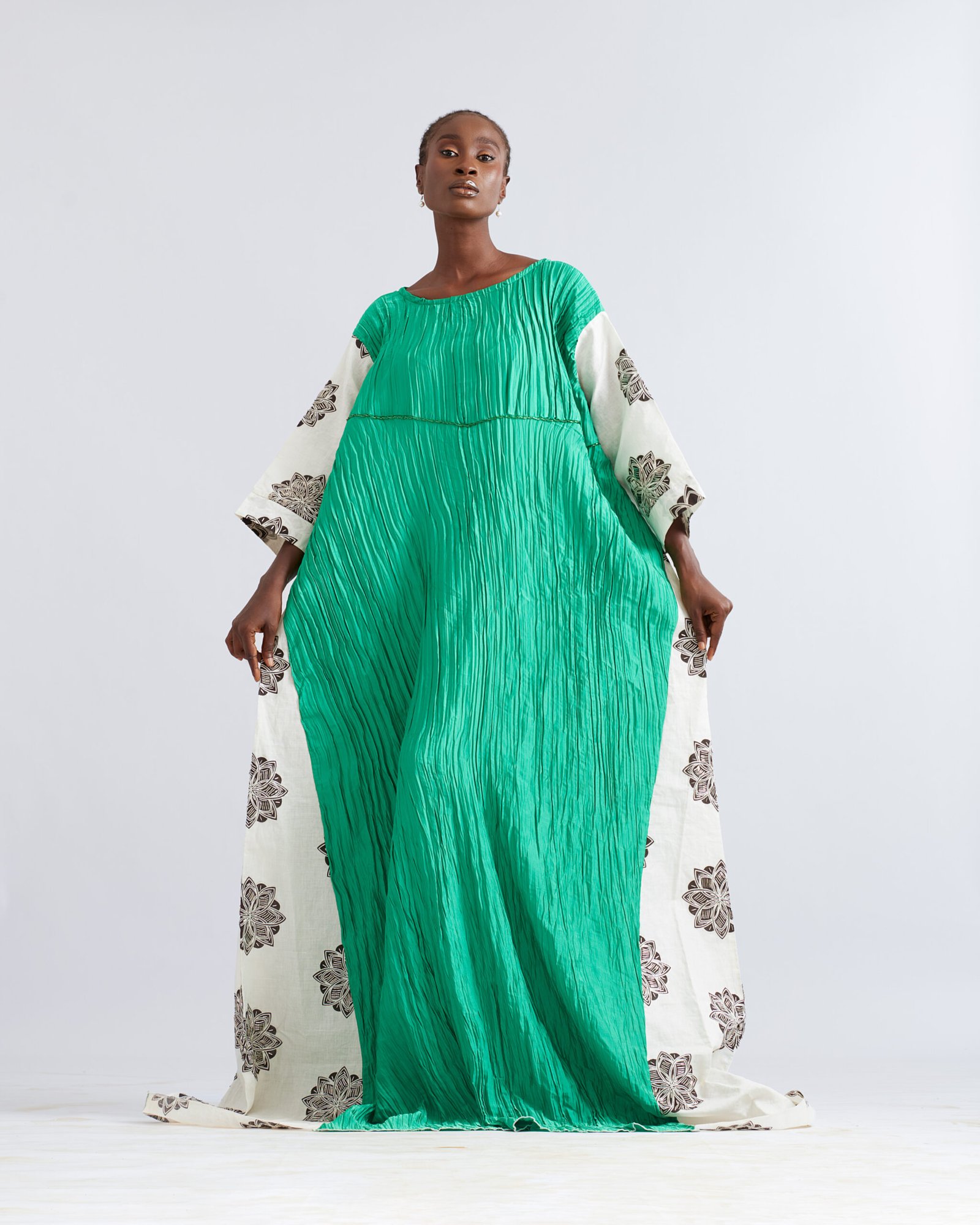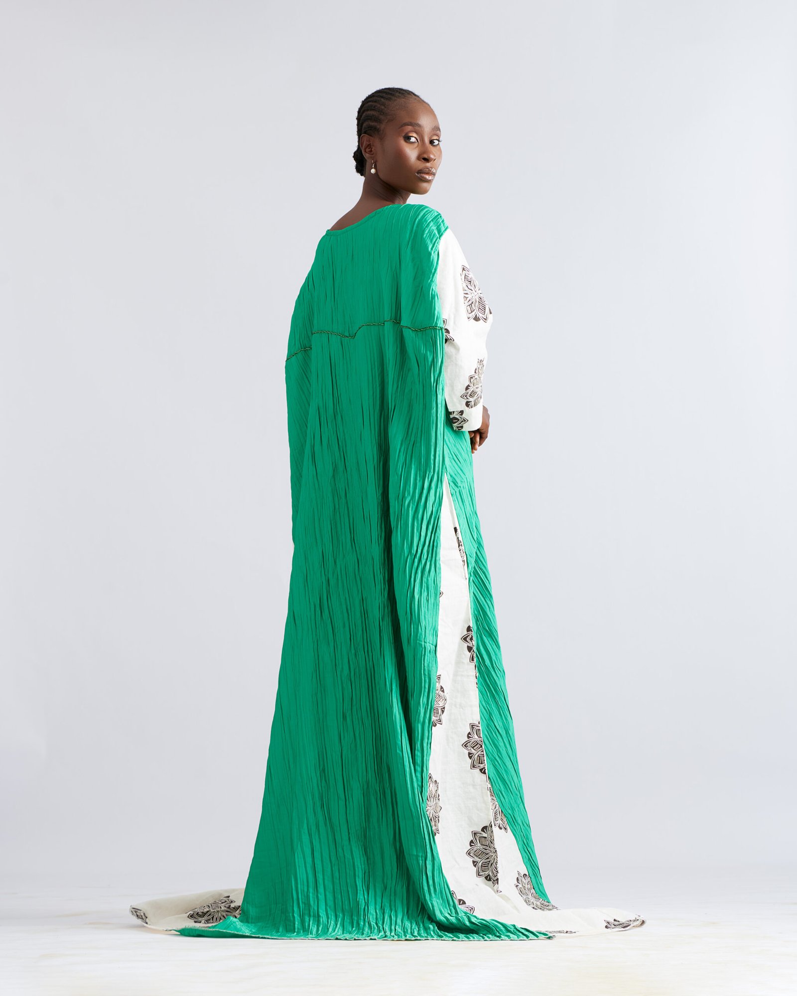 Embrace elegance in the Verdant Bloom with green pleats, ivory accents, and flowing drape. Perfect for festive or elegant gatherings.