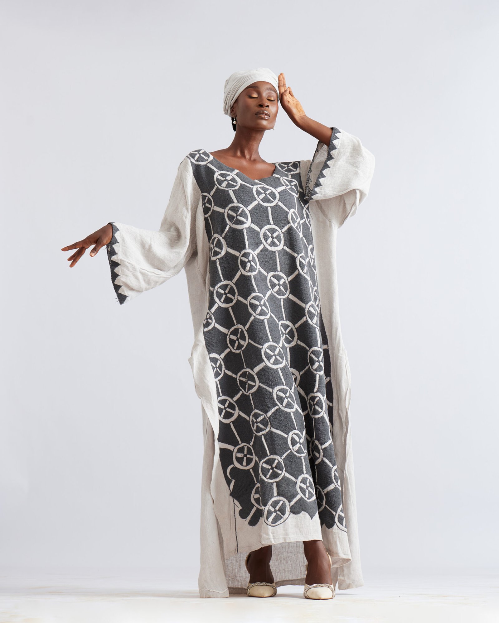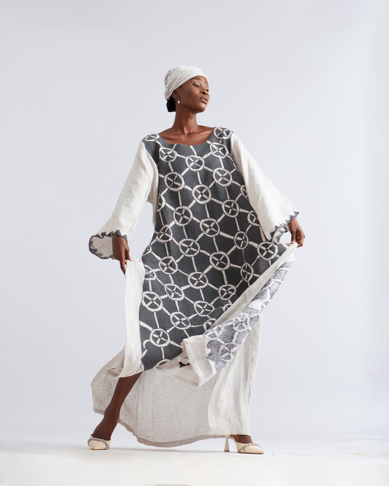This Afrocentric Boubou blends tradition with modern sophistication, featuring a bold geometric charcoal motif, ivory bell sleeves, and a matching headwrap. A graceful statement for special occasions or refined everyday elegance.
