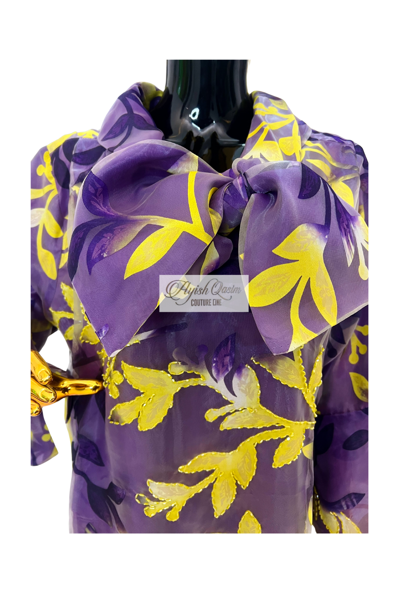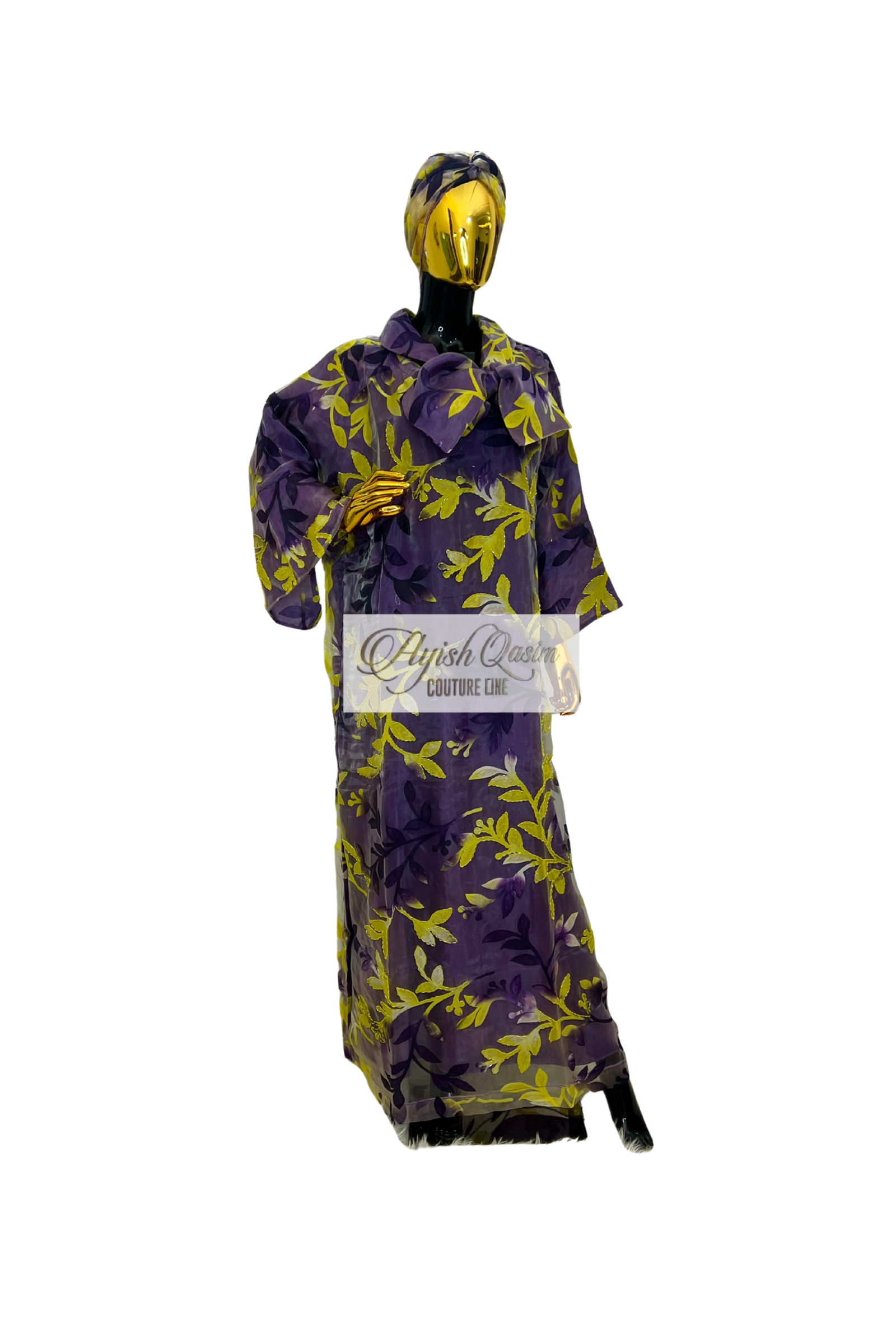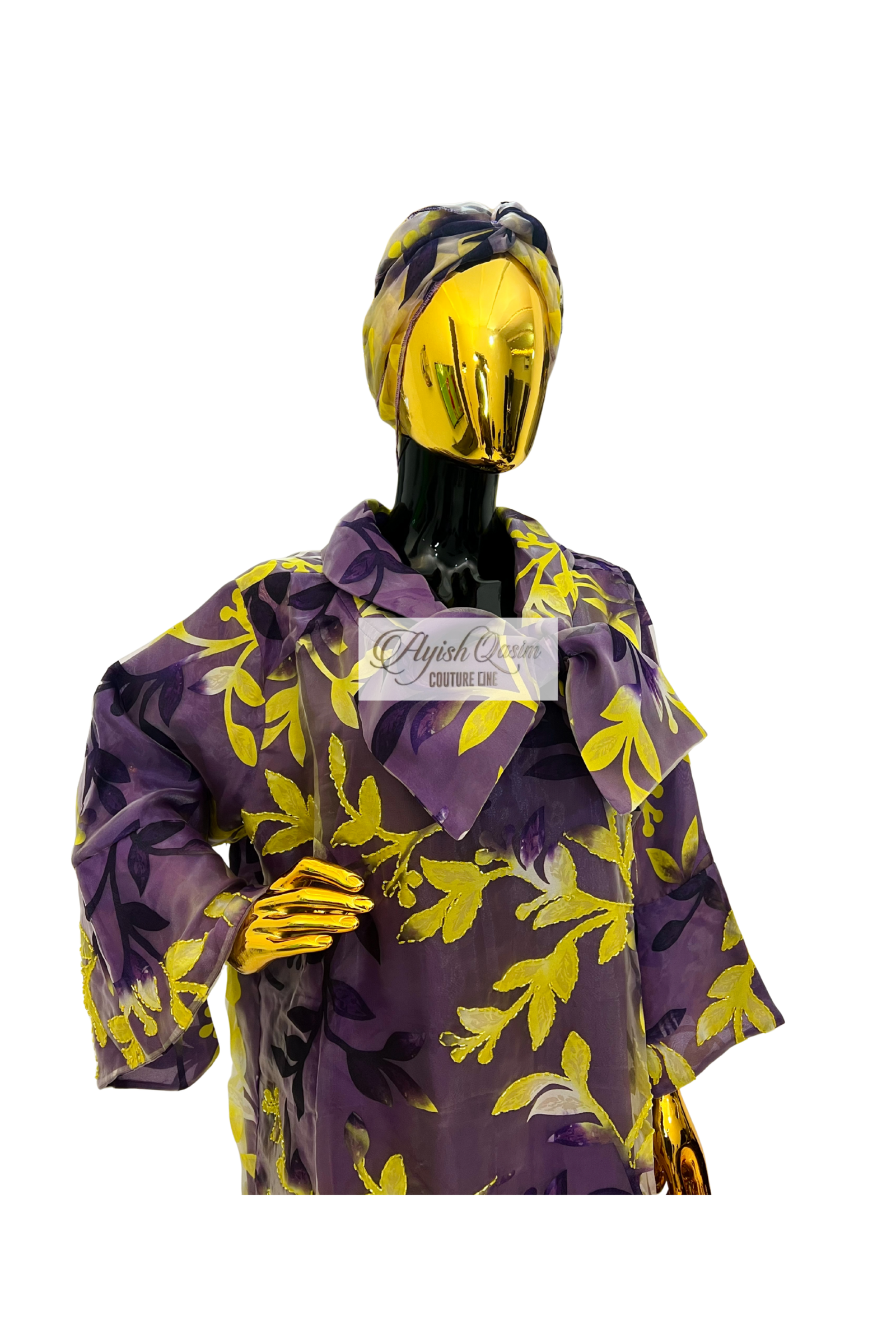 A sheer organza dress in rich purple tones, brought to life with vibrant yellow floral accents that add depth and movement. Designed with a soft, flowing silhouette and paired with a matching headtie, it delivers a light, luminous elegance with a bold, artistic edge.