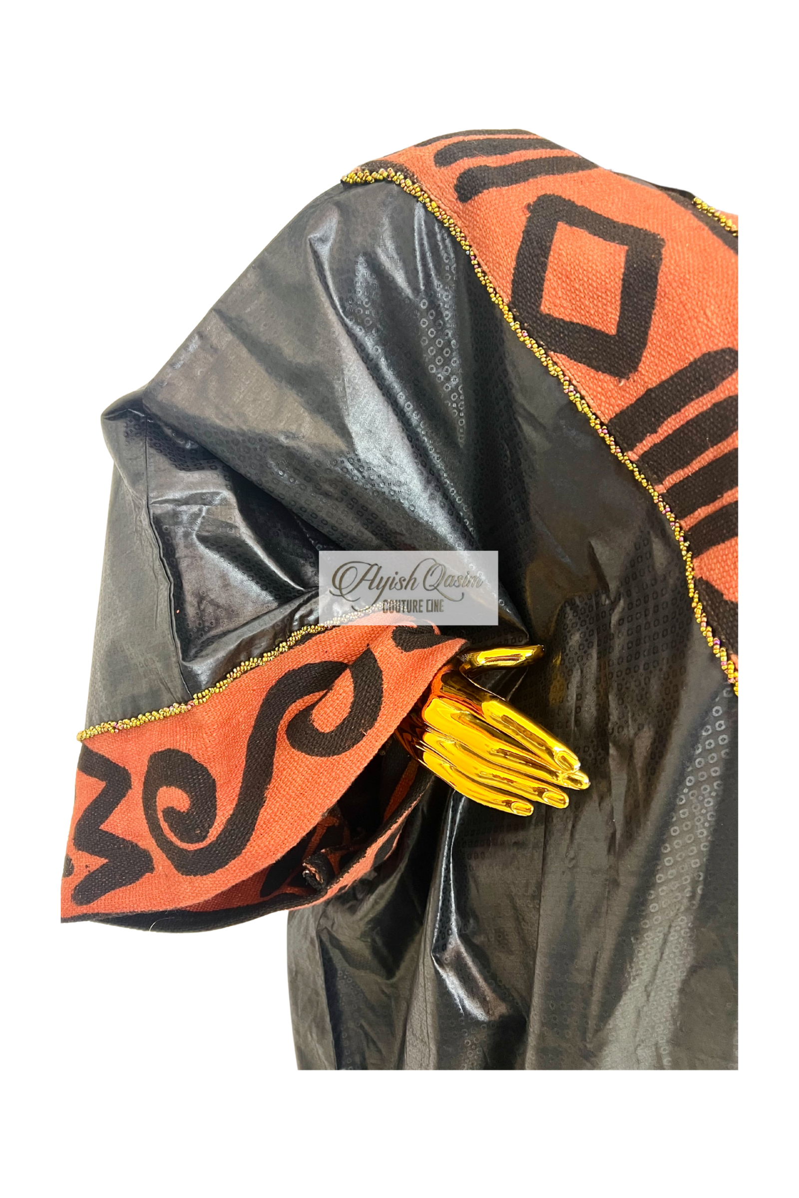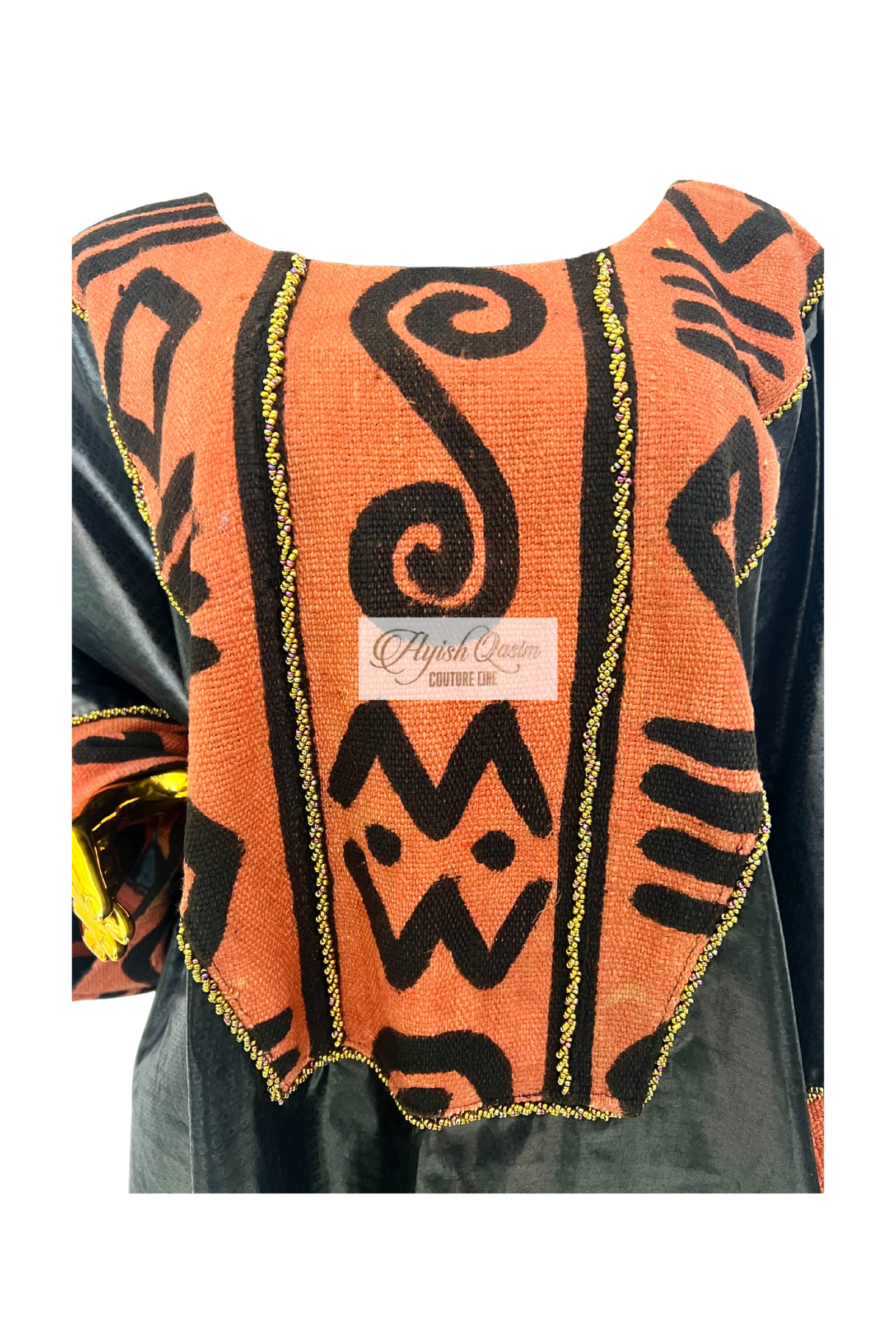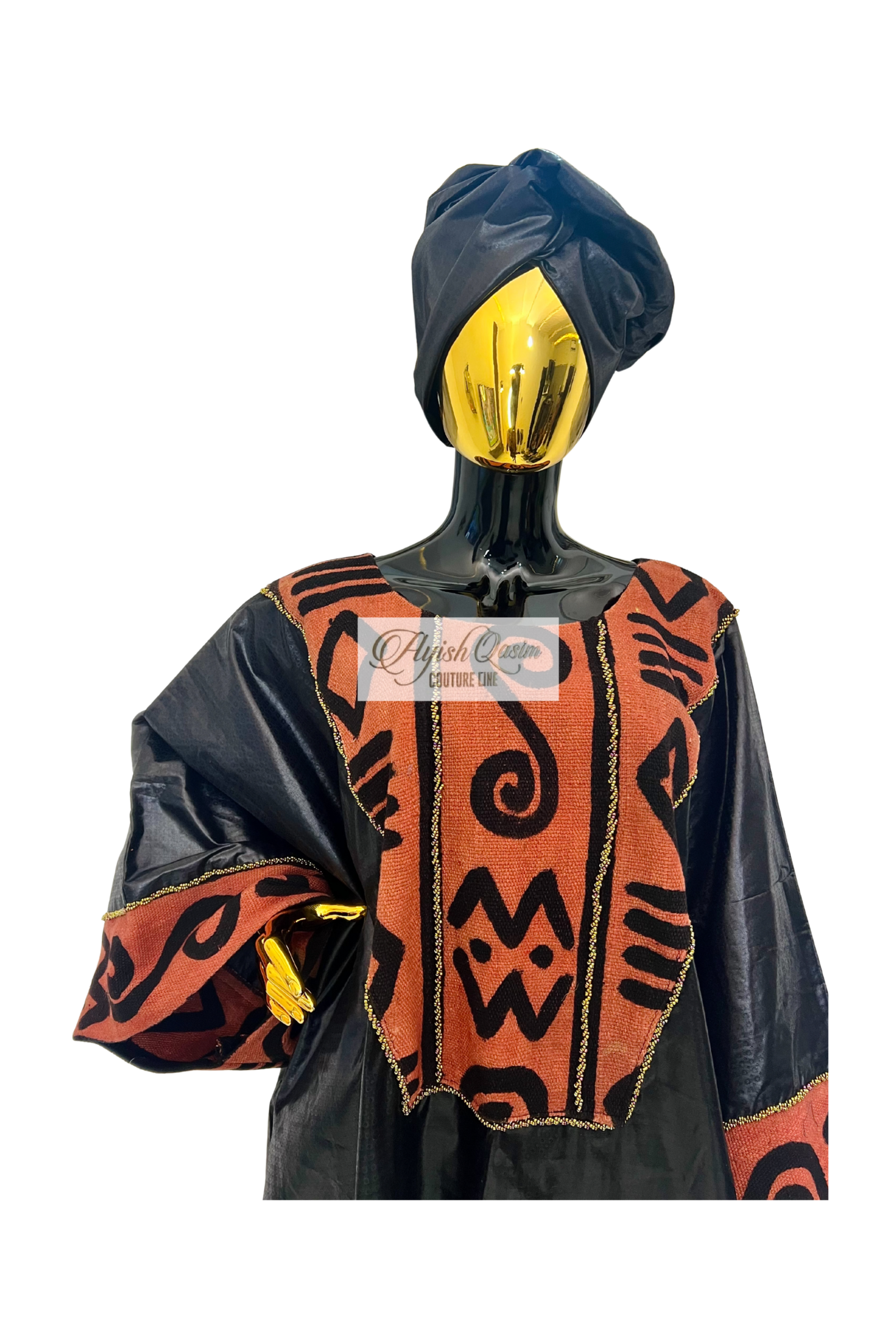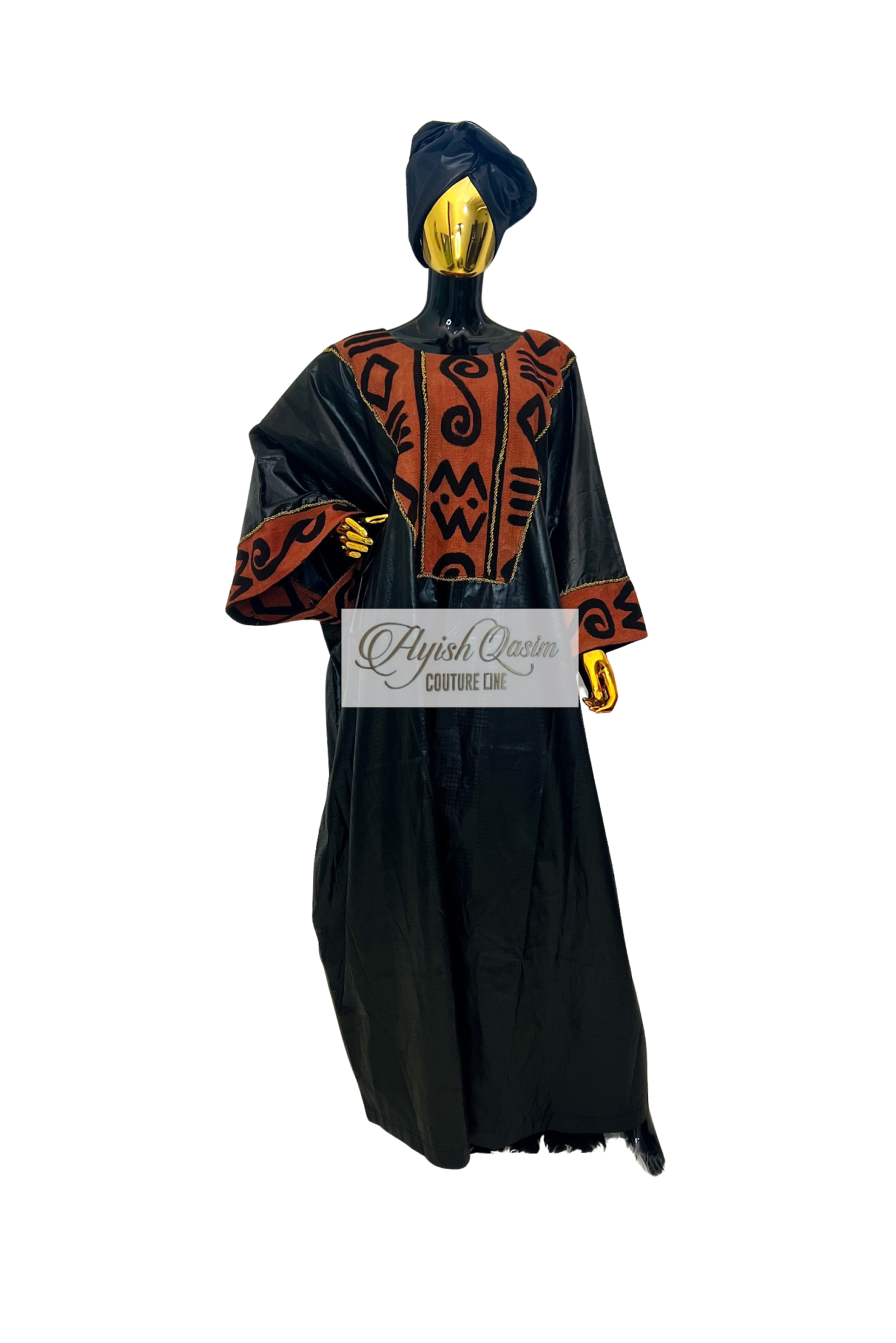 A striking dress crafted from smooth Getzner fabric, elevated with bogolanfini that frame the silhouette with rich, cultural texture. Finished with a matching headtie, it blends tradition and modern elegance in a confident, statement look.
