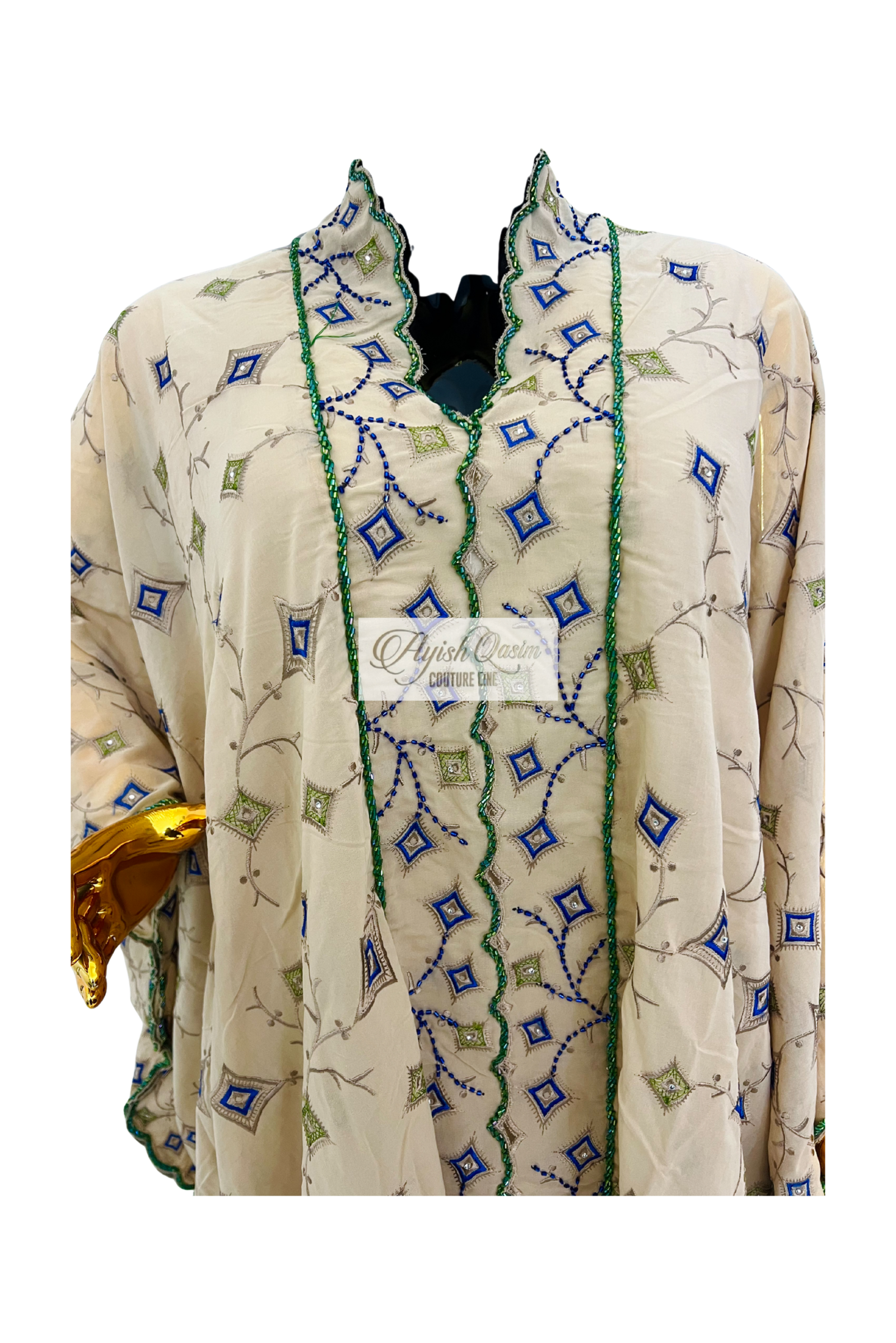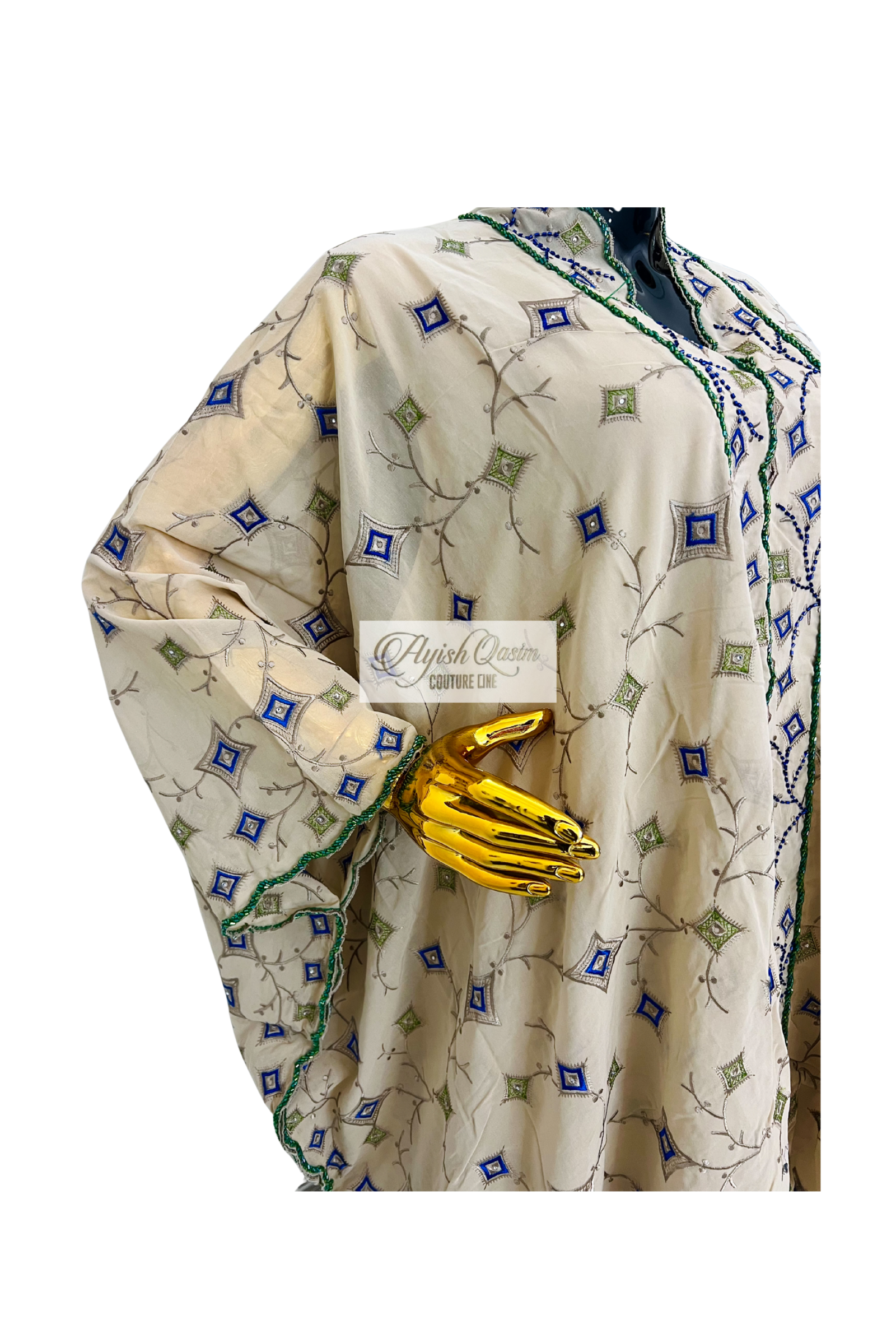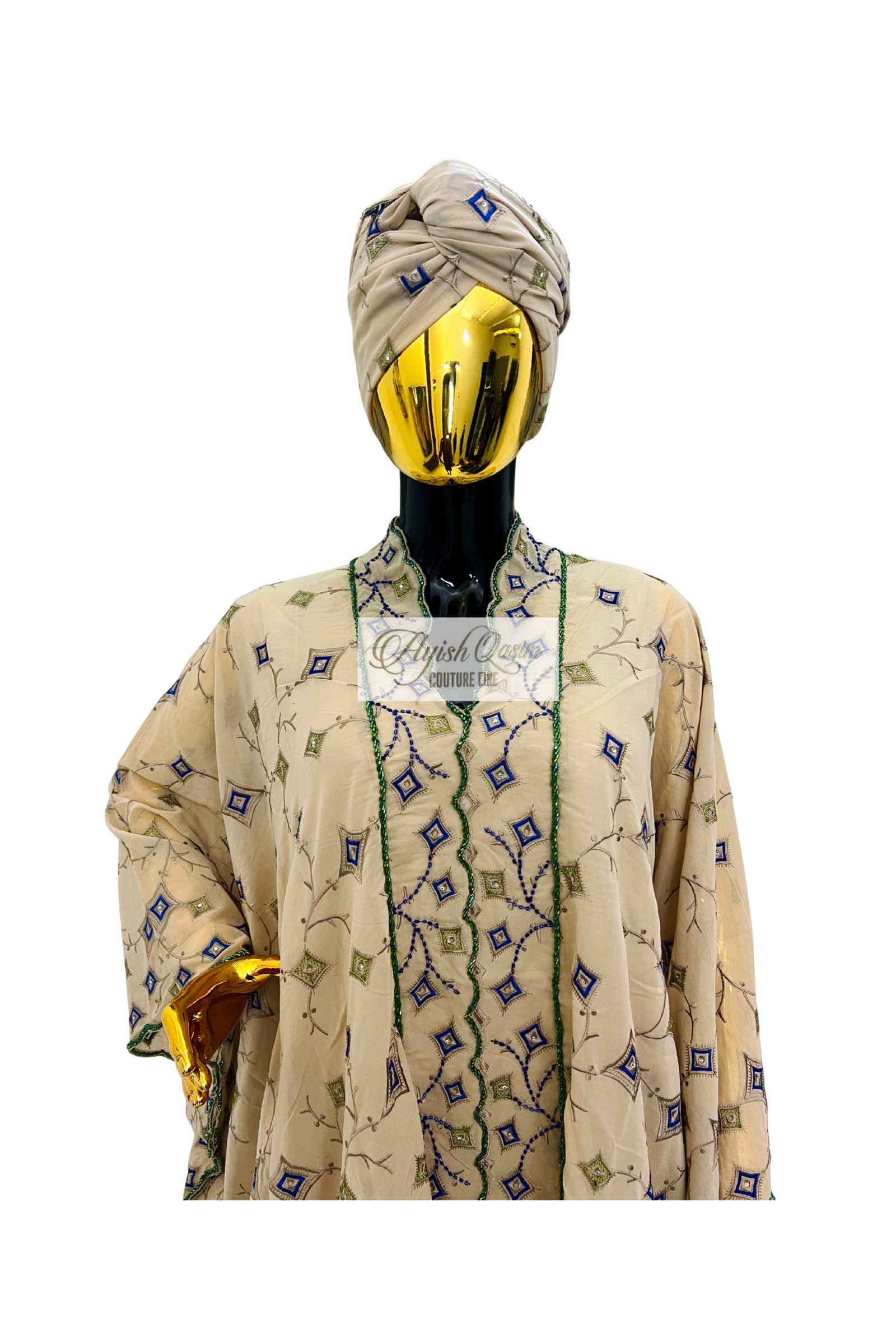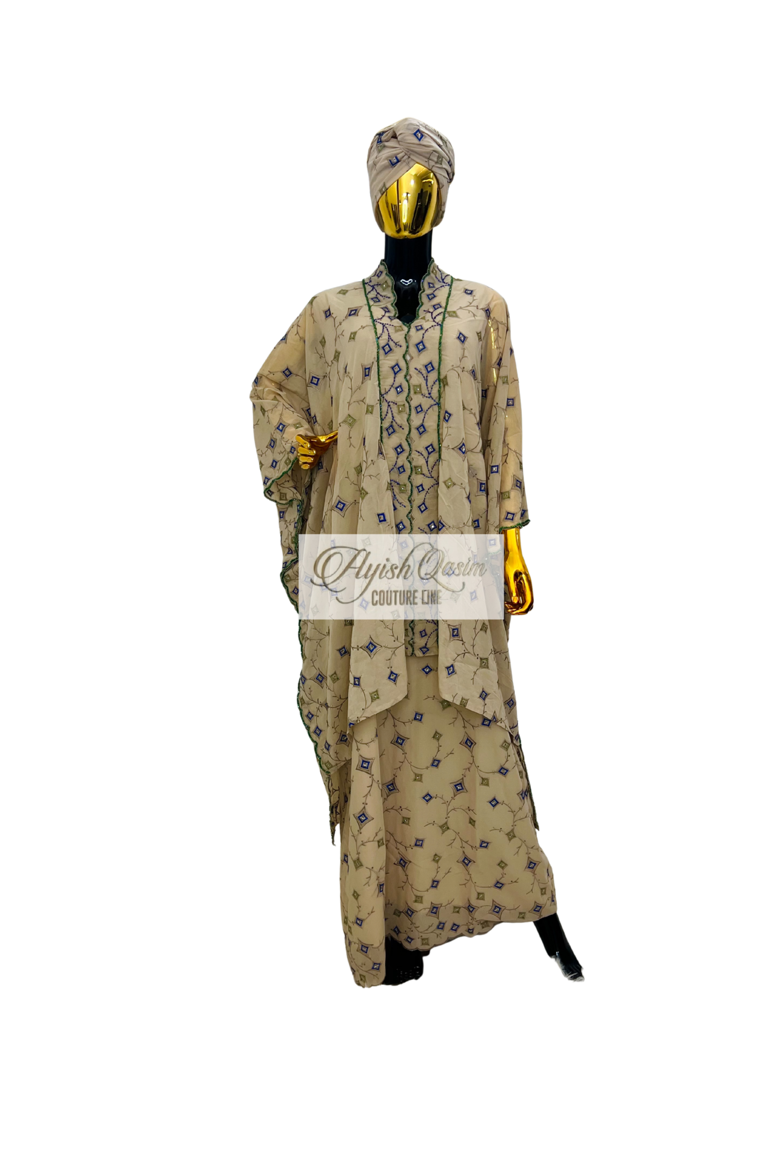 A refined dress crafted from delicate Swiss lace in a soft champagne beige tone, accented with intricate geometric embroidery in subtle blue and green hues. Designed with a relaxed, flowing silhouette and paired with a matching headtie, it offers a graceful blend of softness, detail, and understated luxury.