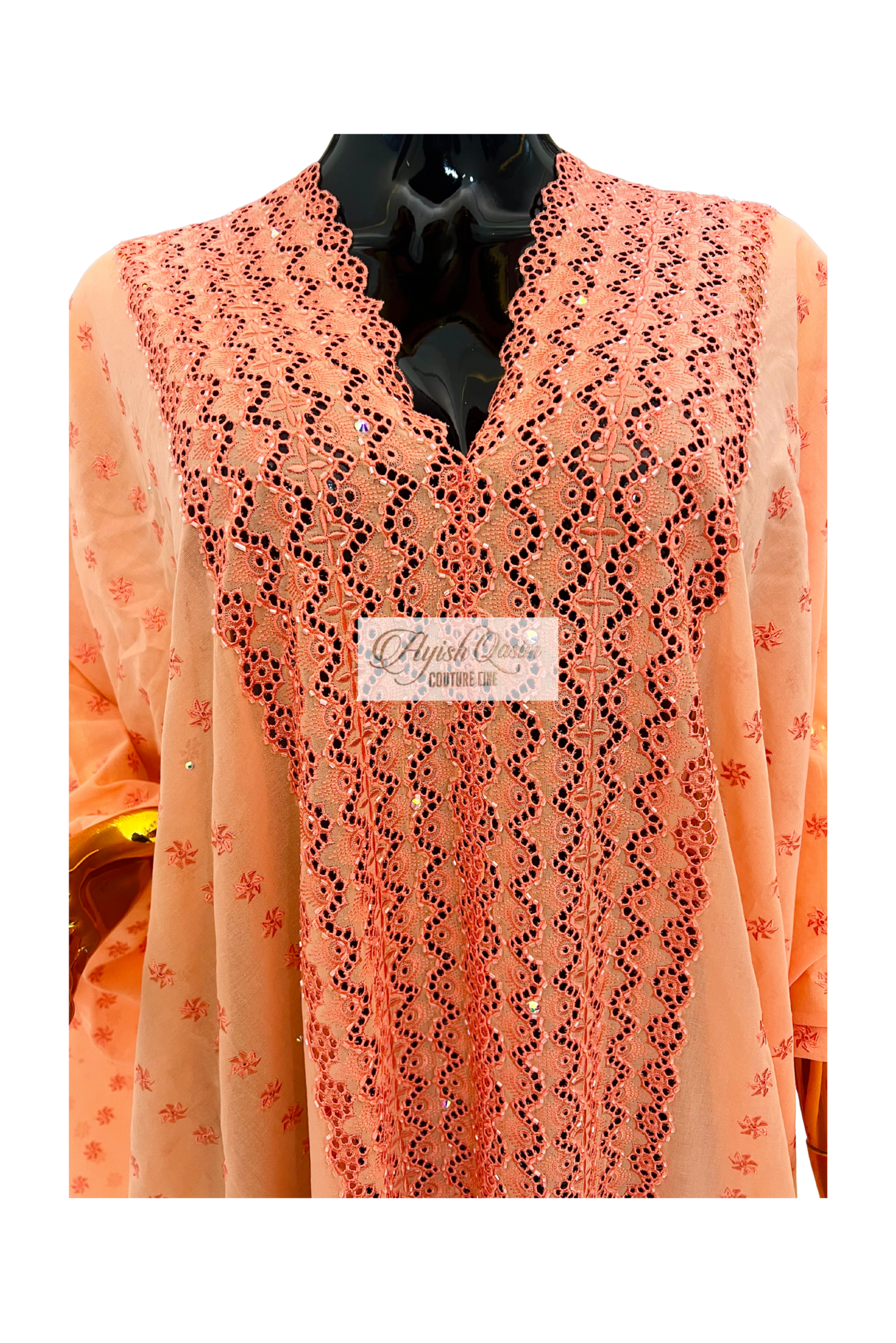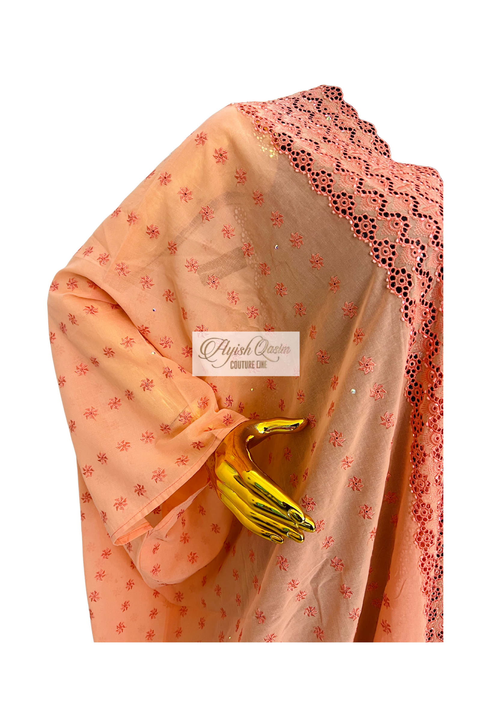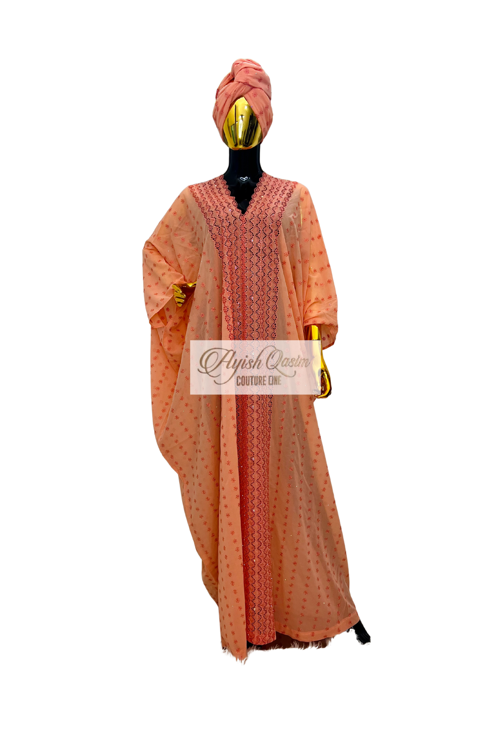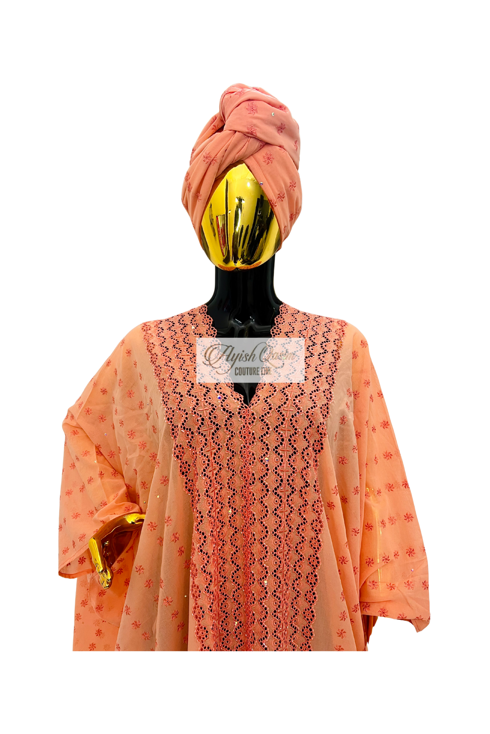 A vibrant dress crafted from delicate Swiss lace in a warm coral tone, detailed with intricate patterned embroidery that runs elegantly down the front. Designed in a relaxed, flowing silhouette and paired with a matching headtie, it offers a soft yet striking blend of color, texture, and refined elegance.
