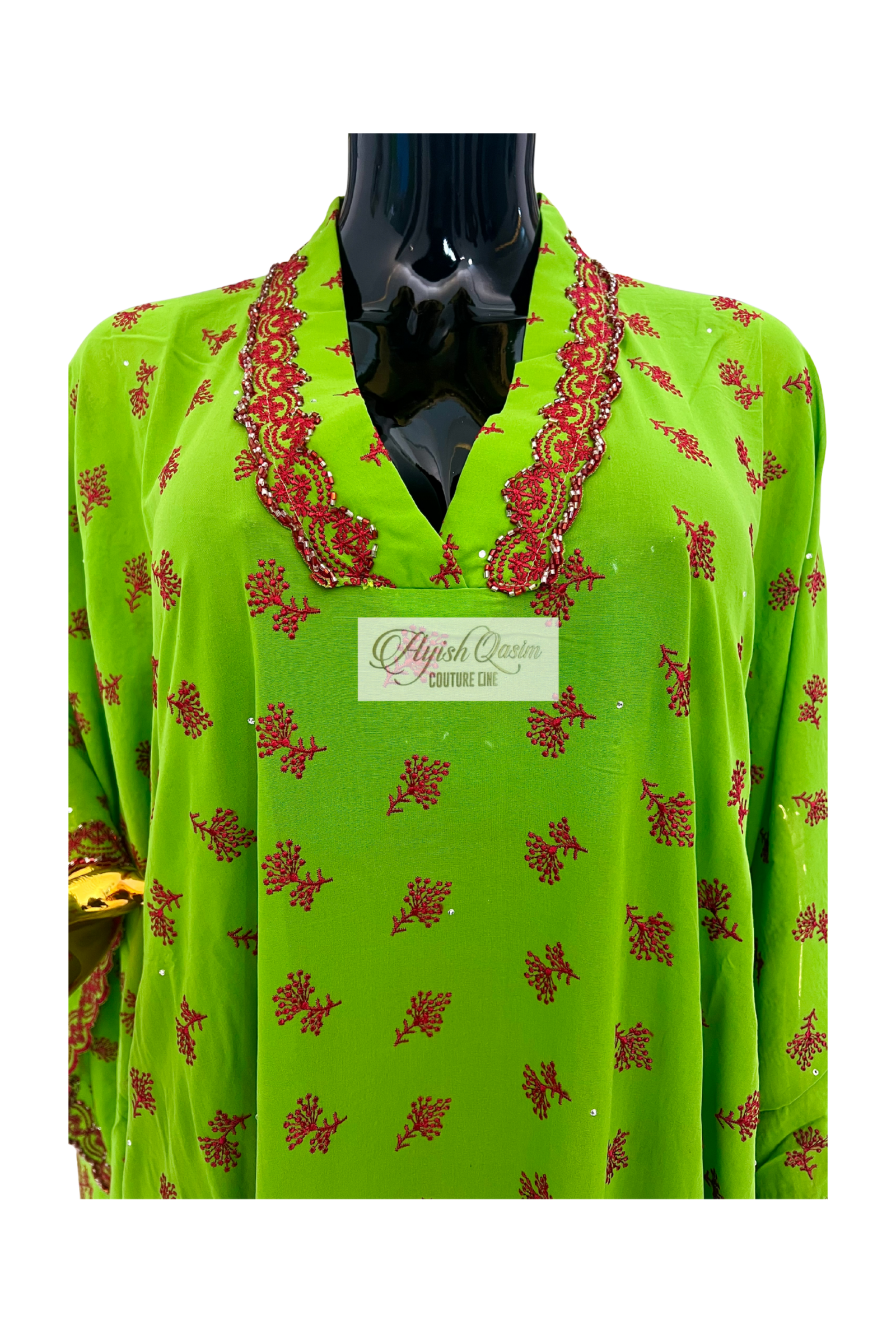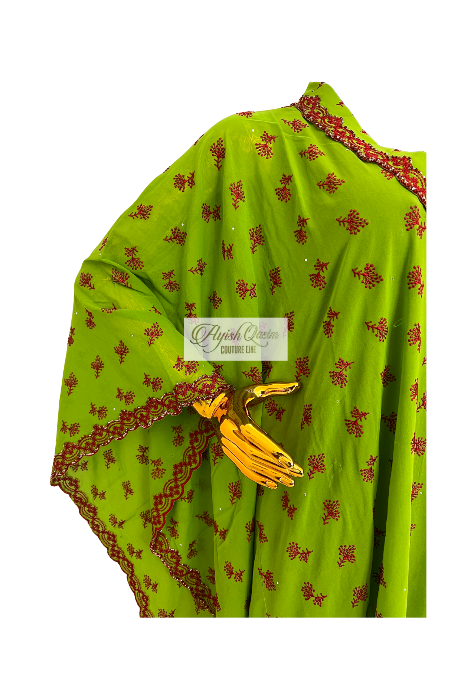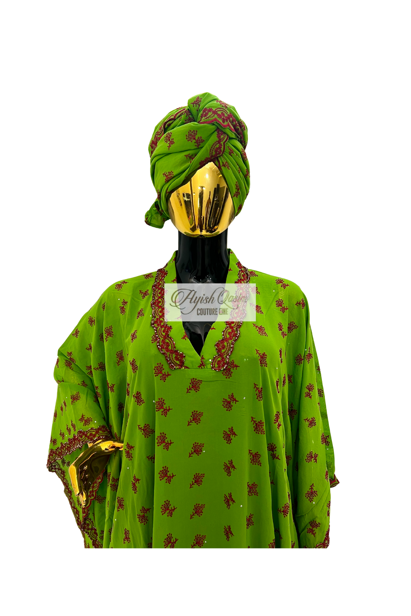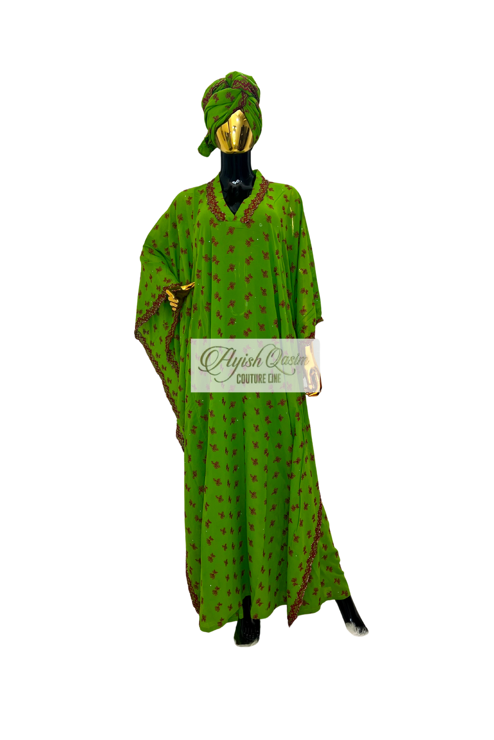 A vibrant dress crafted from delicate Swiss lace in a rich emerald tone, accented with intricate patterned embroidery that adds depth and texture throughout. Designed in a relaxed, flowing silhouette and paired with a matching headtie, it delivers a bold yet refined statement with effortless elegance.