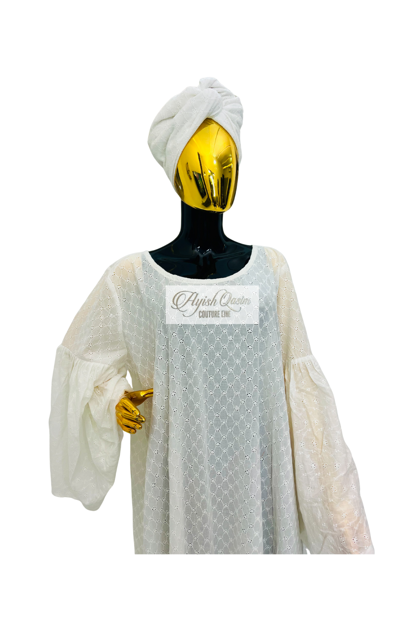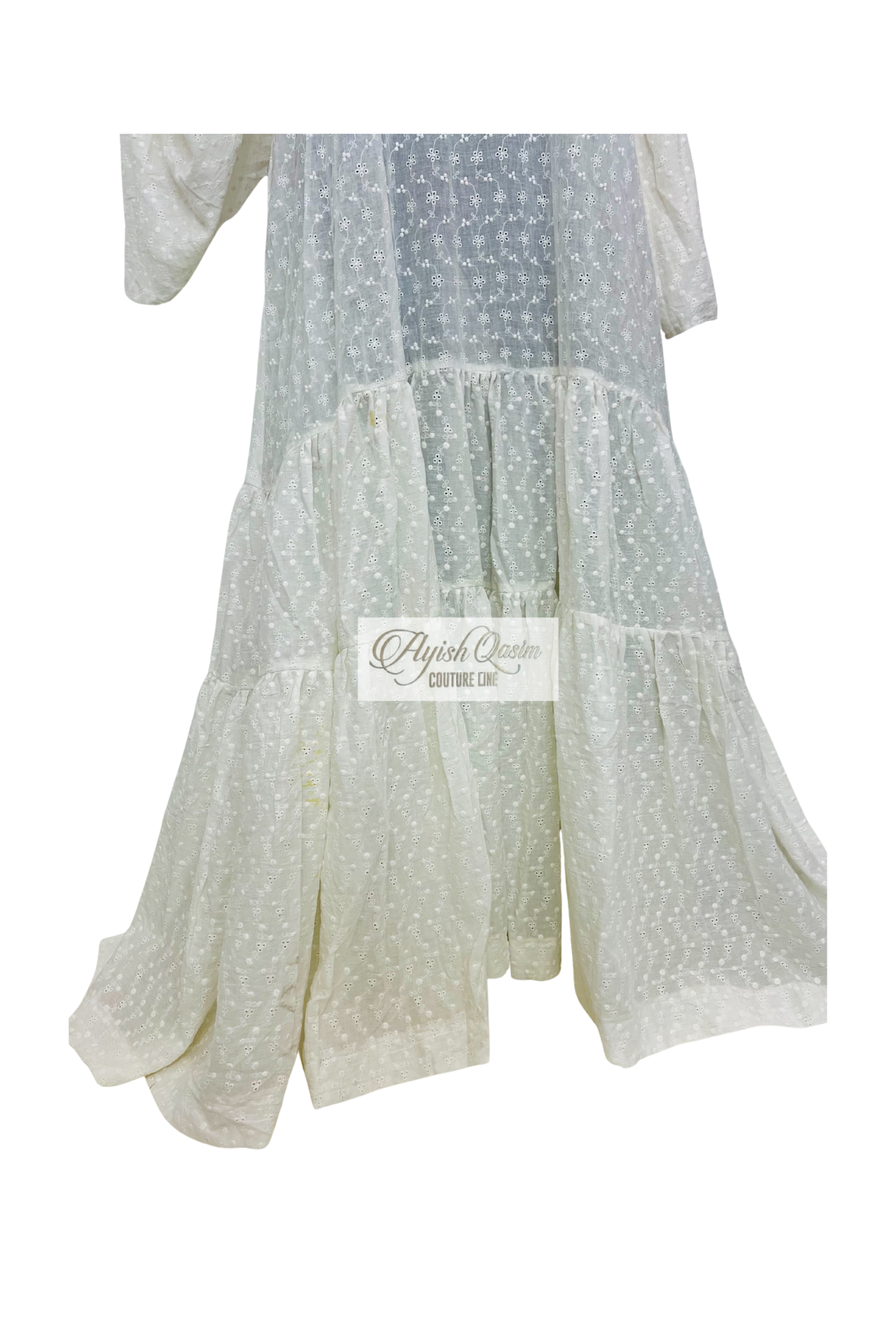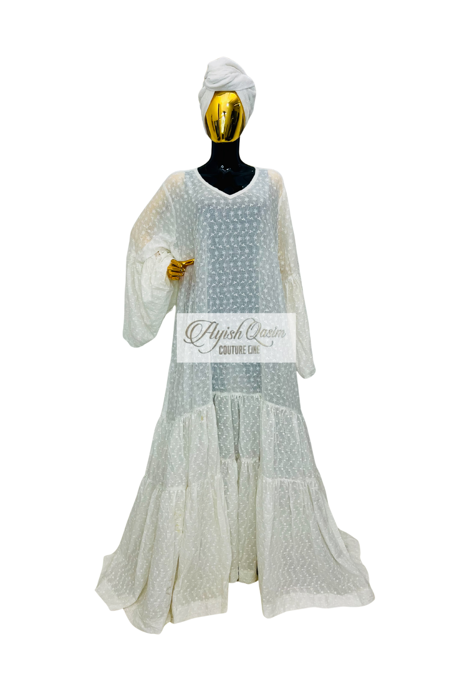 A soft white dress crafted from delicate cotton lace, designed with a breezy, tiered silhouette that moves with effortless grace. Paired with a matching headtie, it offers a light, airy, elegant, subtle, feminine, and quietly captivatin look.