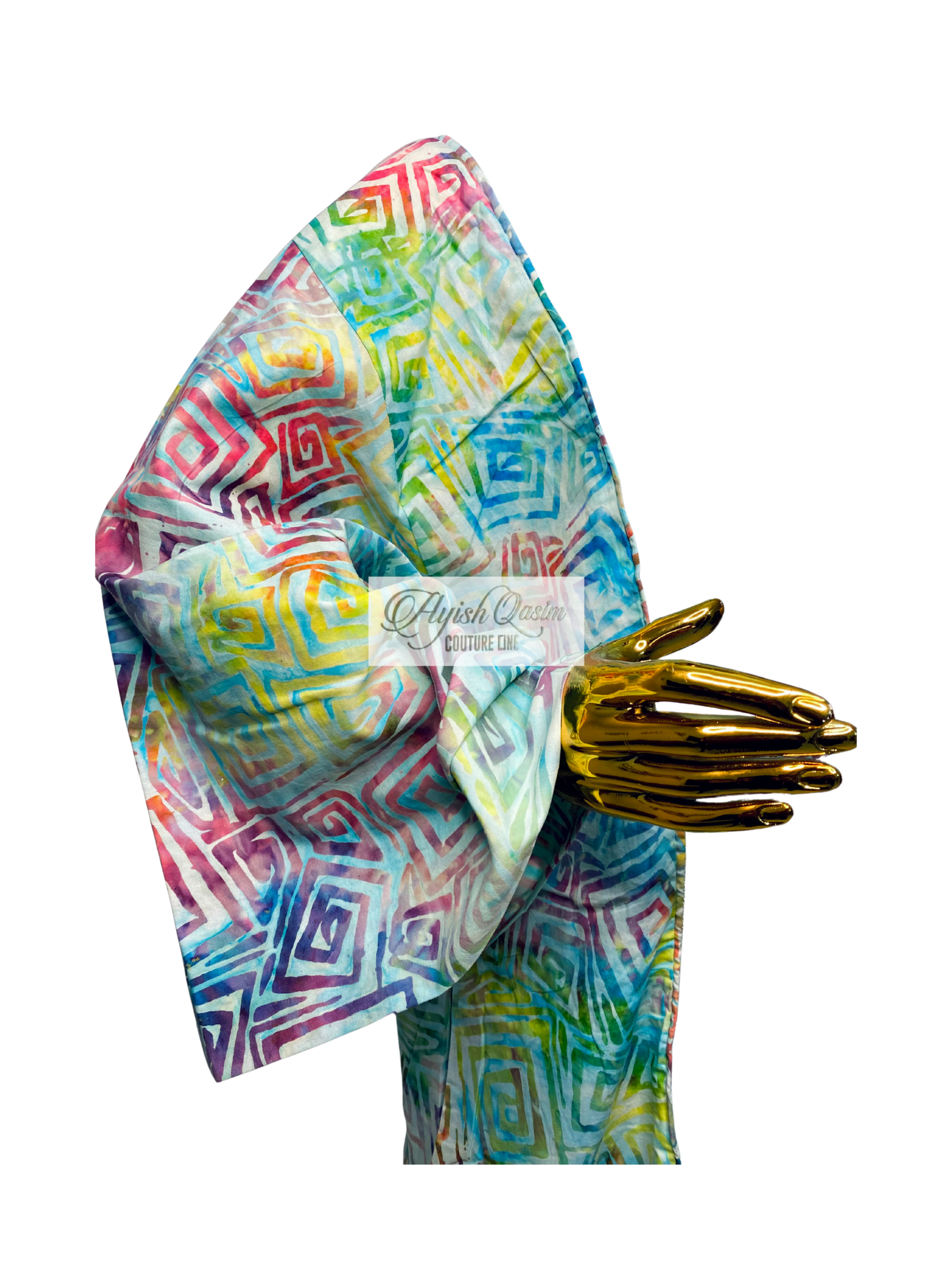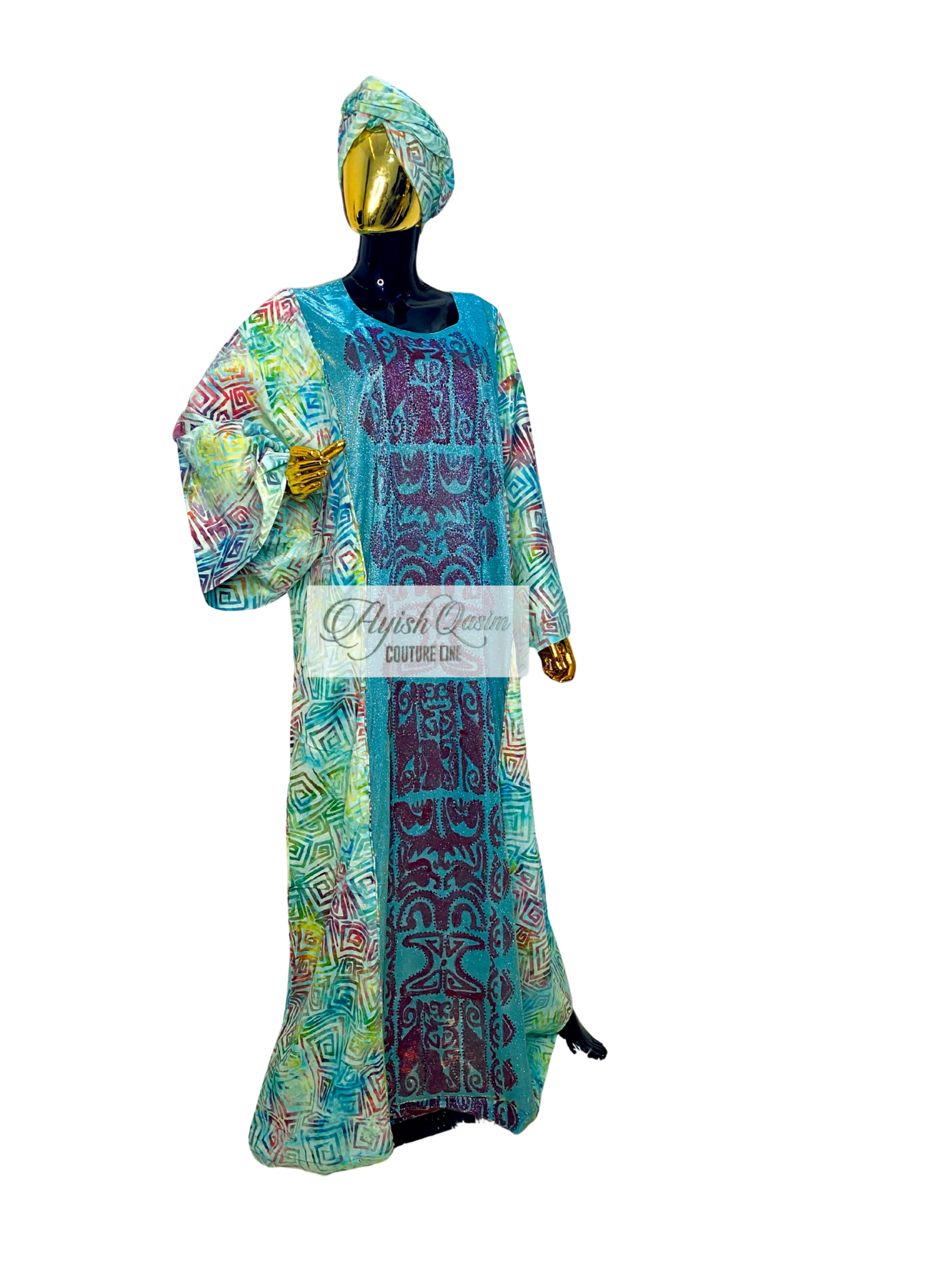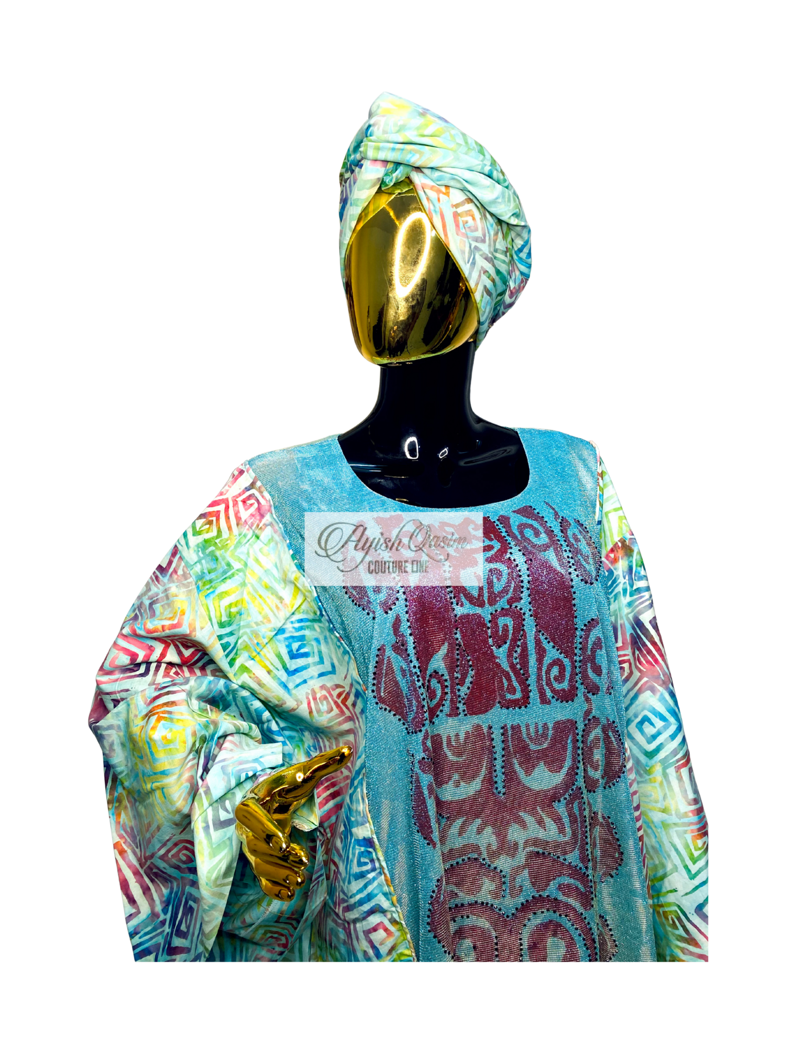 A vibrant dress that blends a soft aqua base with multicolored patterned sleeves and a richly textured front. Designed in a relaxed, flowing silhouette and paired with a matching headtie, it captures a playful mix of color, artistry, and effortless elegance.