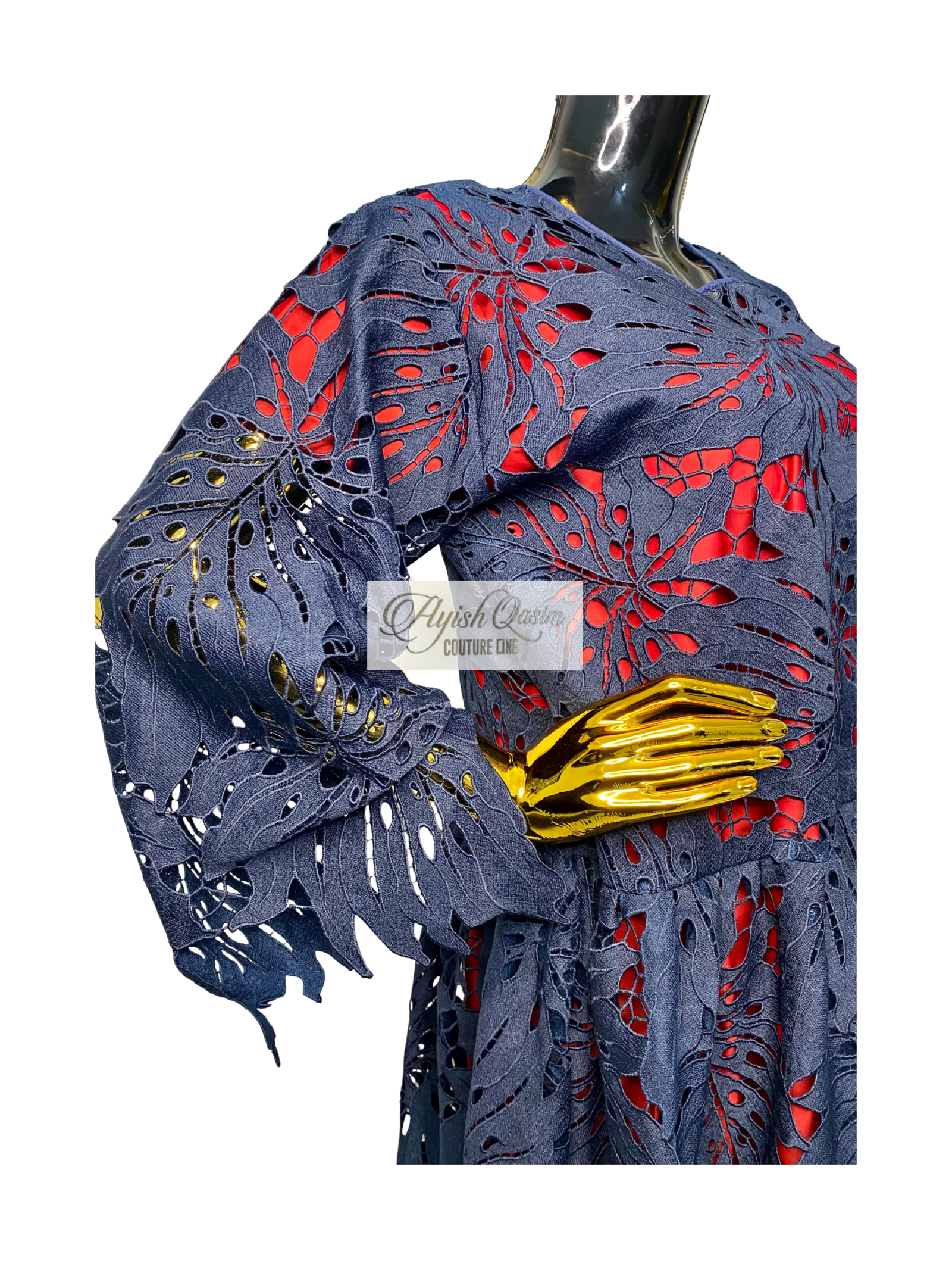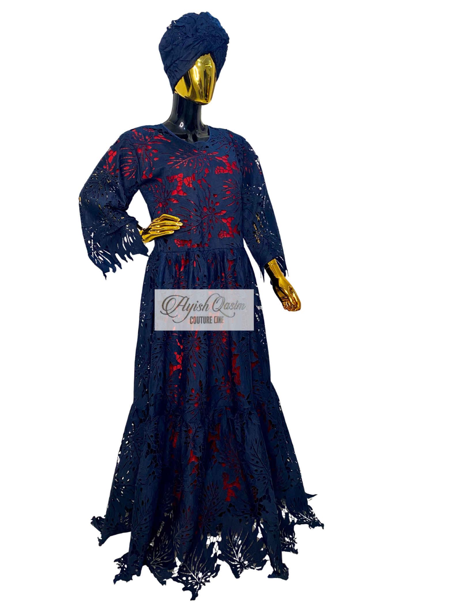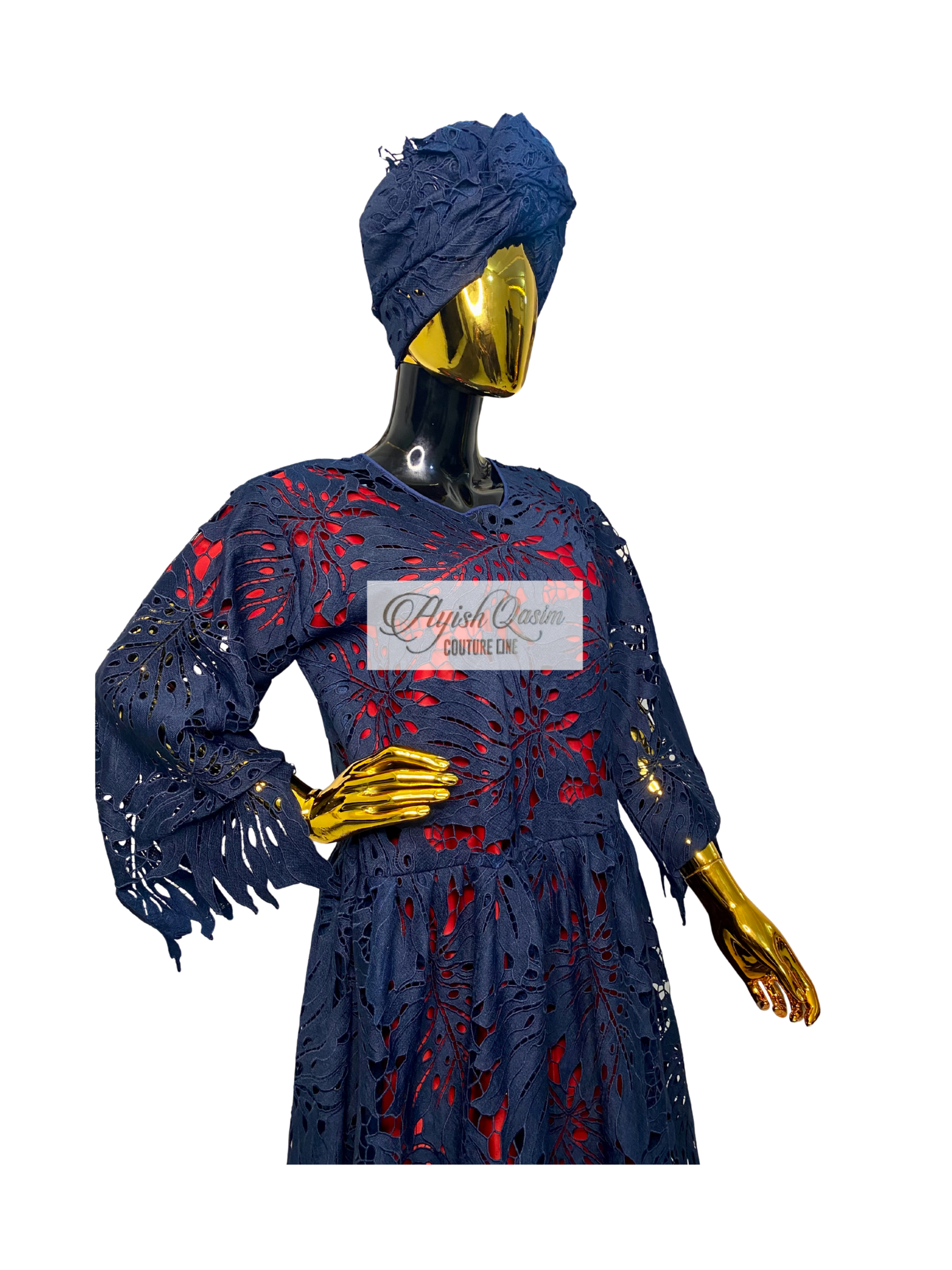 A striking dress crafted in deep navy cutwork lace, layered over a bold red base that subtly glows through the intricate patterns. Designed with a flowing silhouette, textured sleeves, and a matching headtie, it delivers a dramatic contrast—rich, expressive, and unmistakably refined.