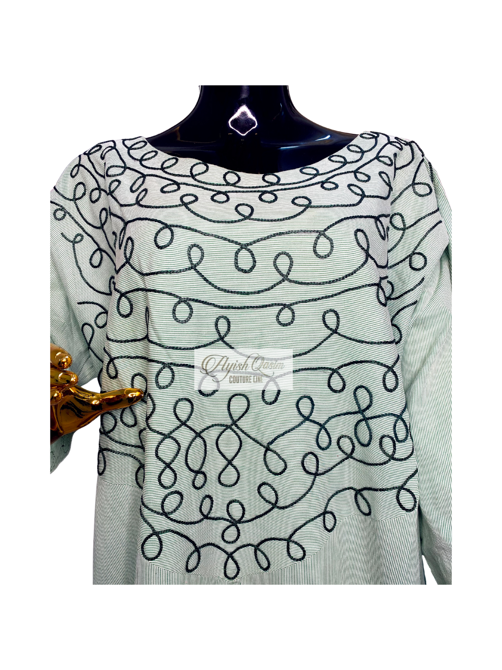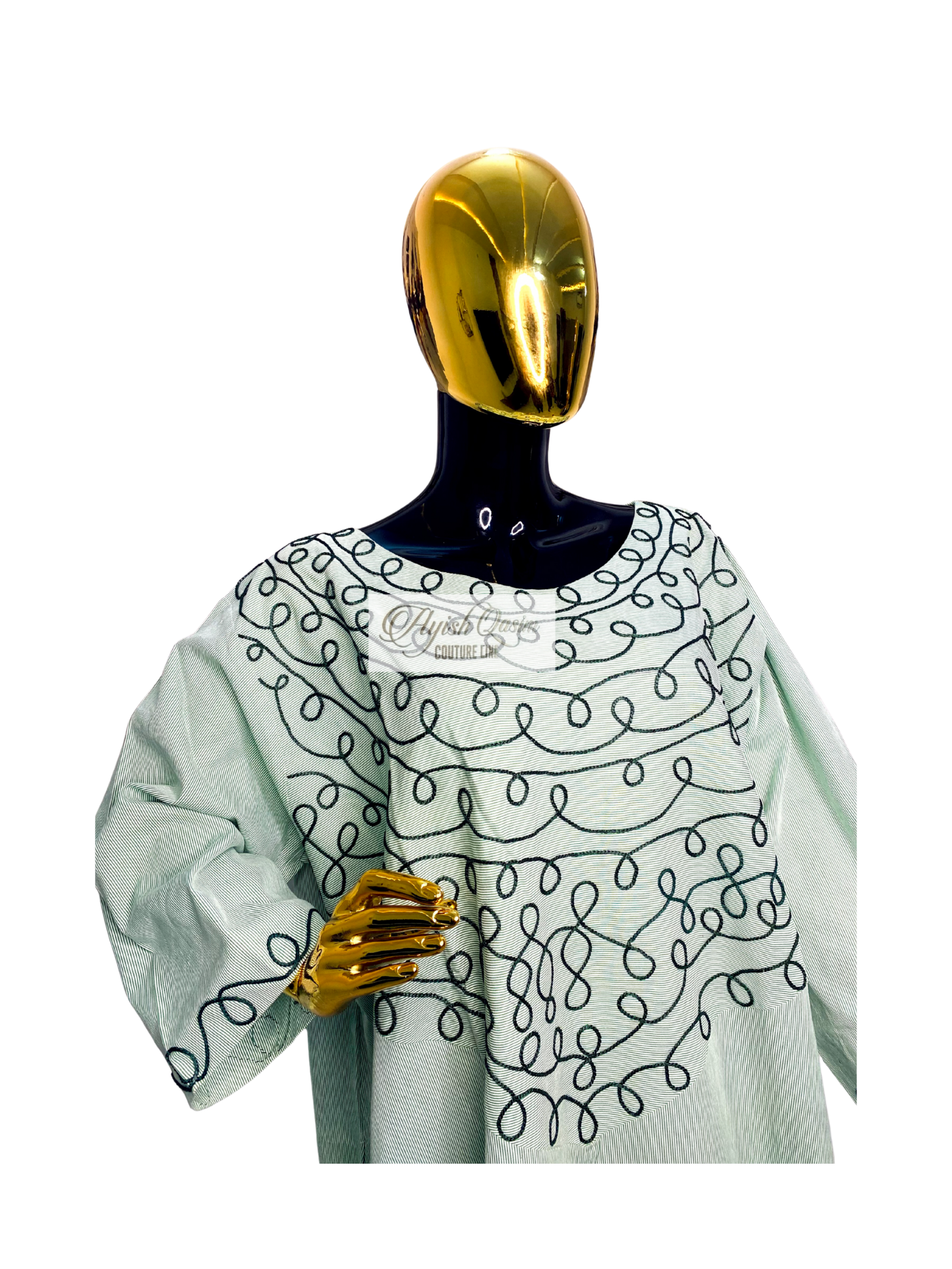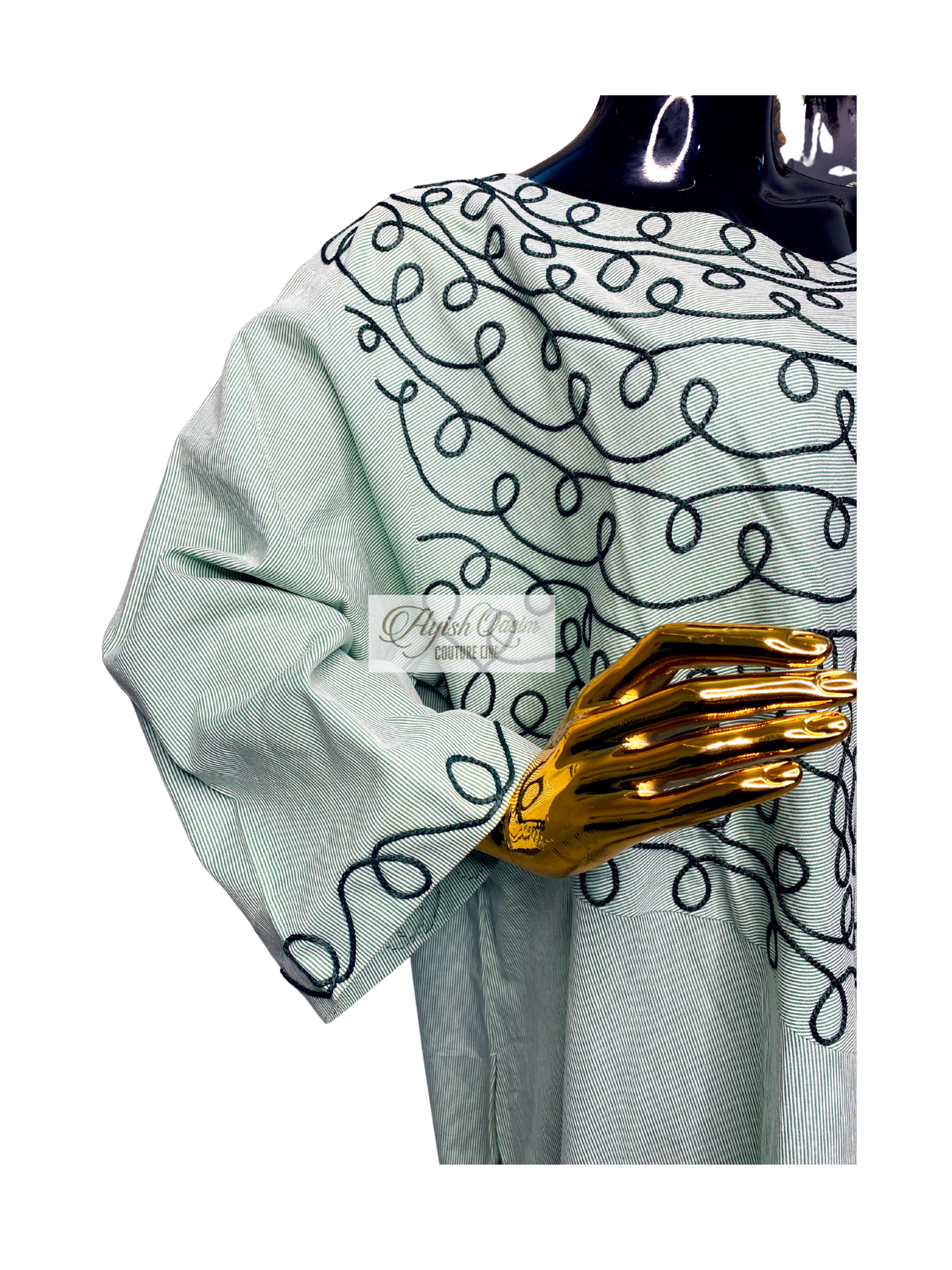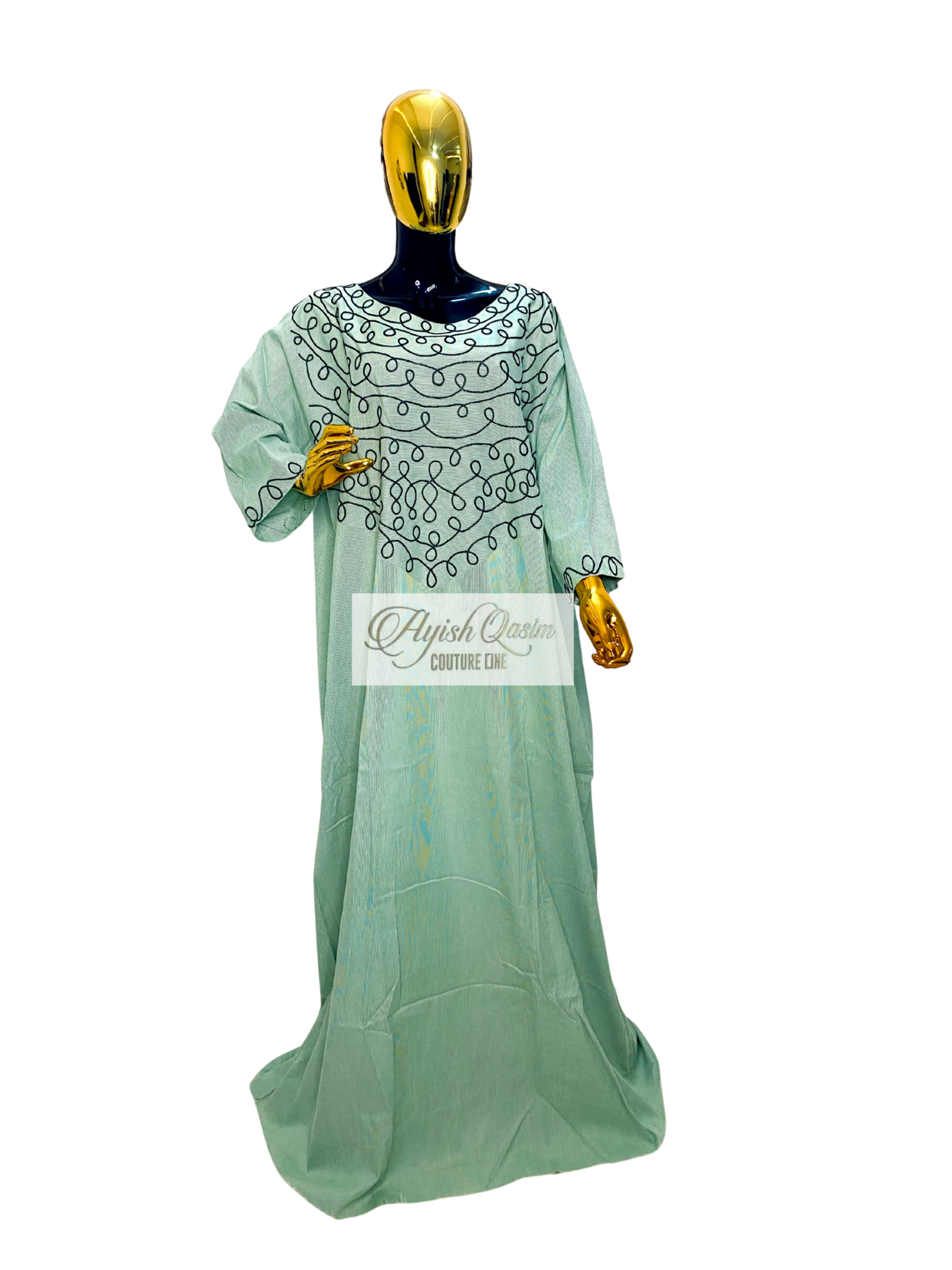 A soft mint-toned dress crafted in a fluid, lightly textured fabric, accented with deep green embroidered lines that form elegant, free-flowing patterns across the bodice. Designed in a relaxed, full-length silhouette with easy movement, it delivers a clean, modern statement with an artistic edge.