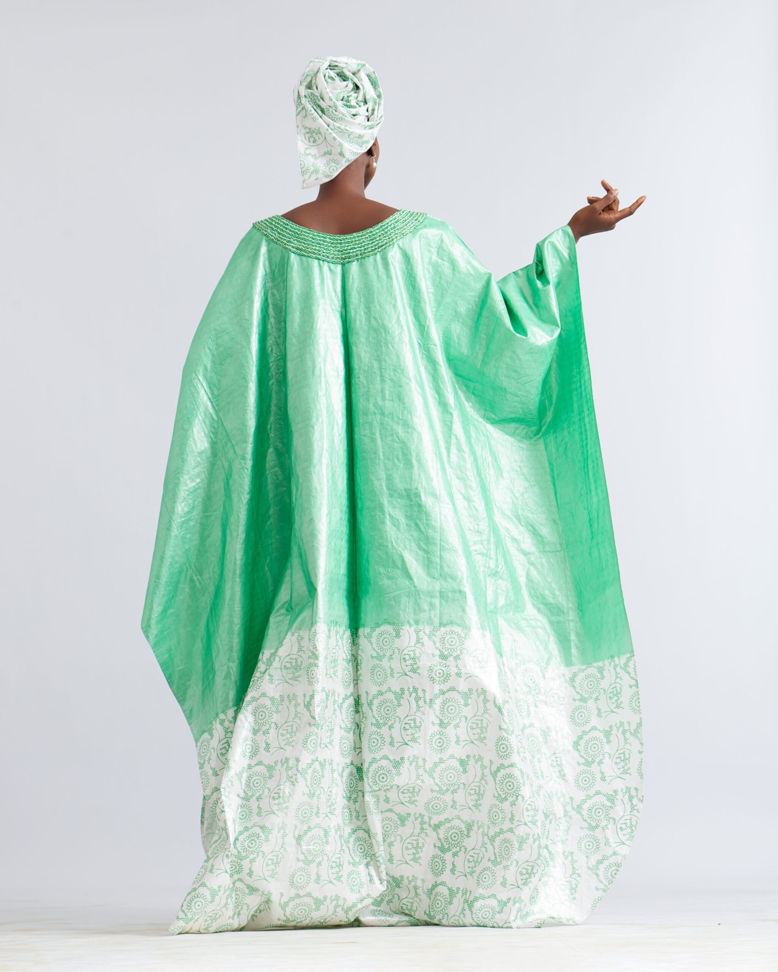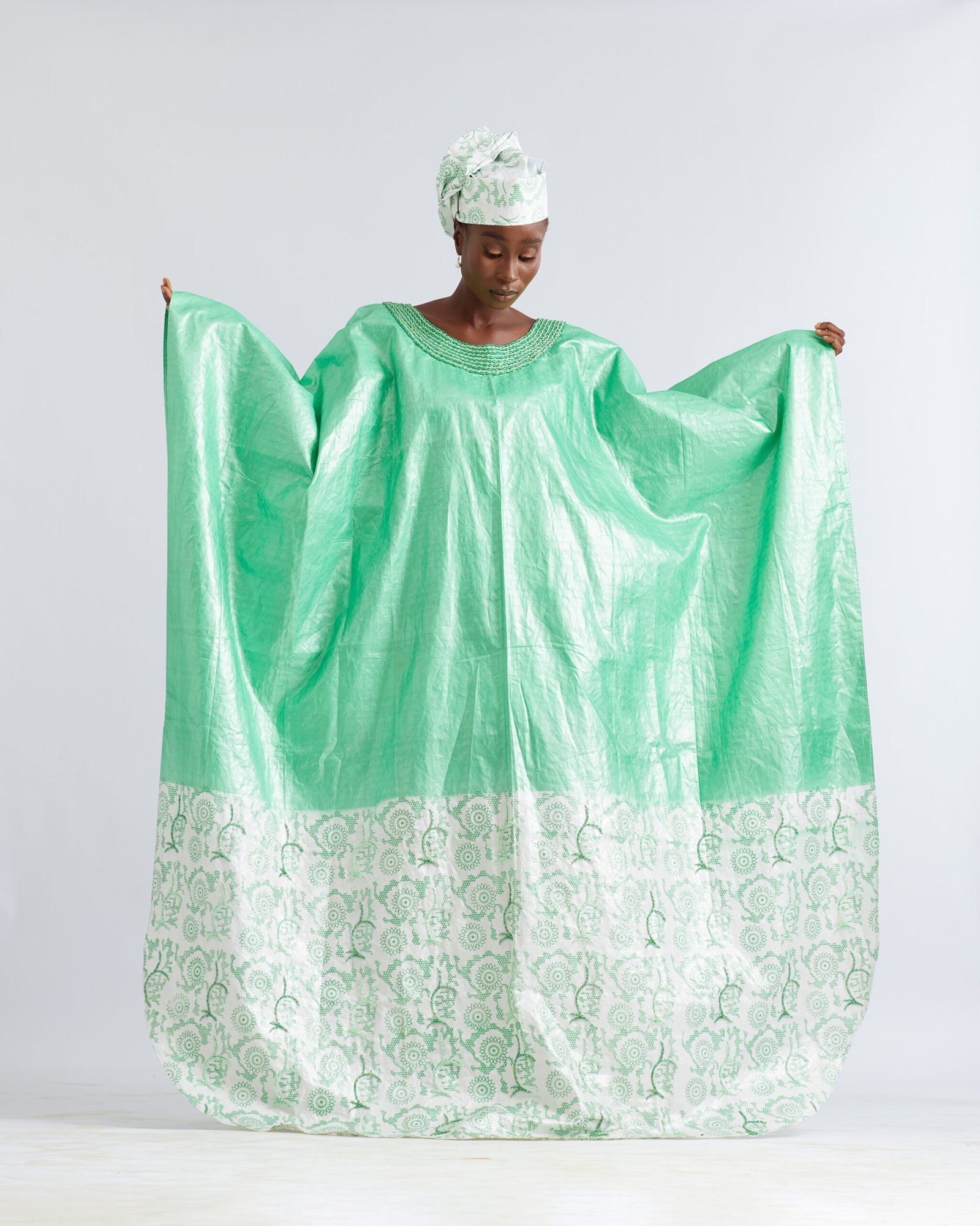 Elevate your presence in our African Luxury Wear, a radiant expression of tradition and elegance, rendered in a lustrous mint green fabric, The lower panel features delicate white and green floral embroidery, adding texture and a regal flourish to the silhouette. Paired with a matching embellished headwrap.