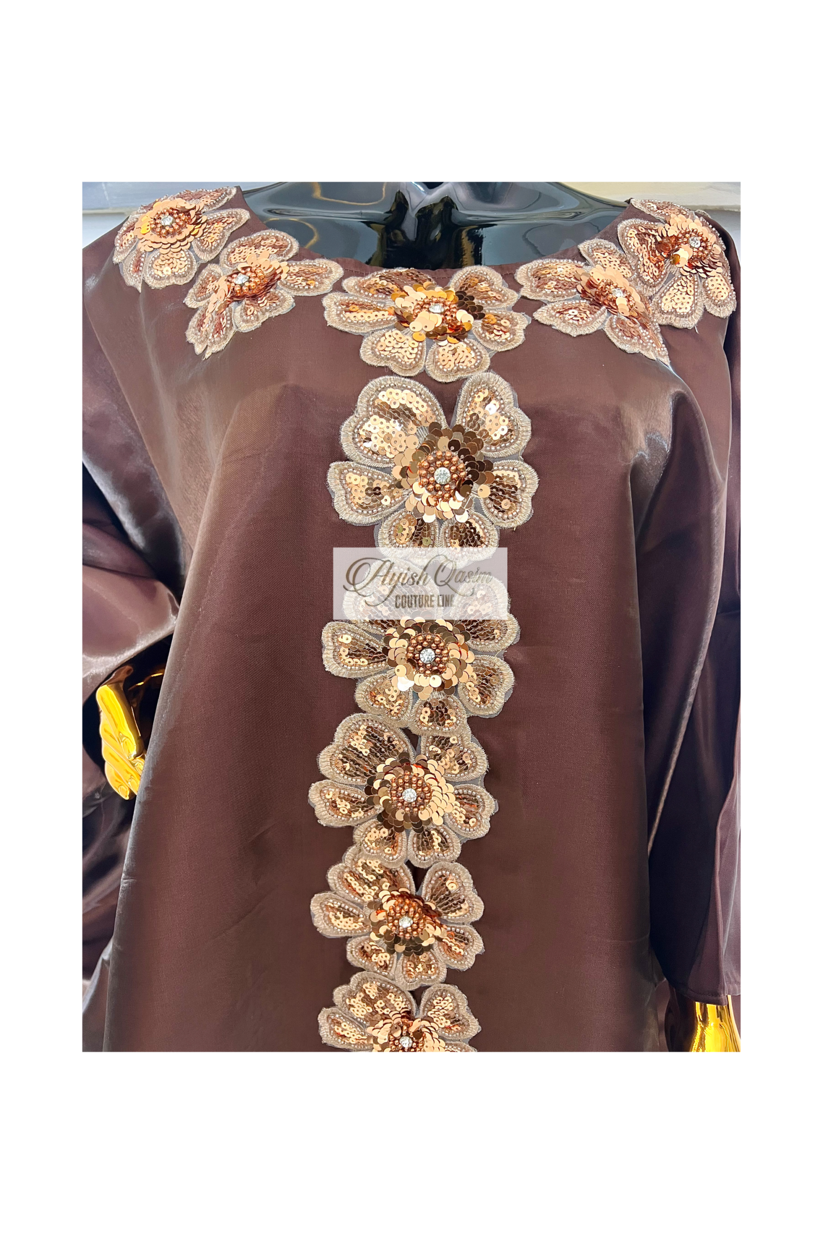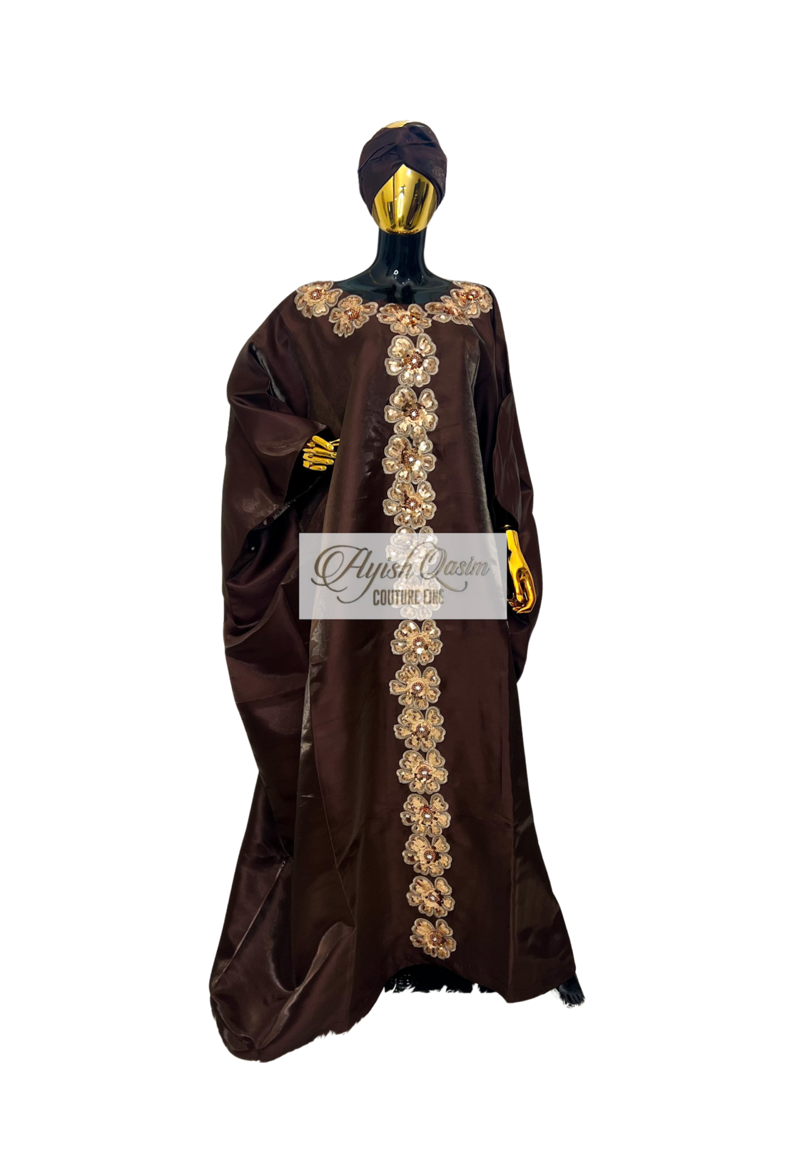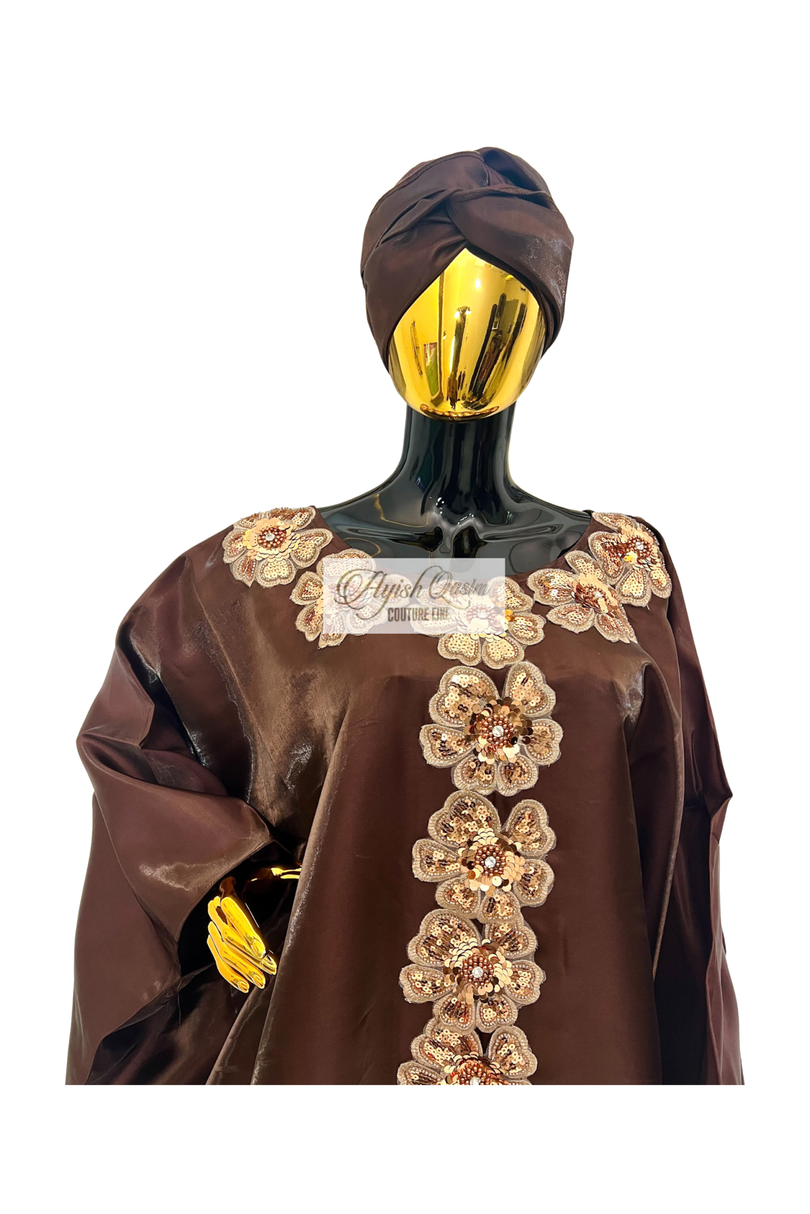 A rich brown dress crafted in fluid liquid satin, featuring a graceful cascade of intricate embroidery that runs elegantly down the front and around the neckline. Designed in a relaxed, flowing silhouette and paired with a matching headtie, it offers a refined, luminous look with timeless appeal.