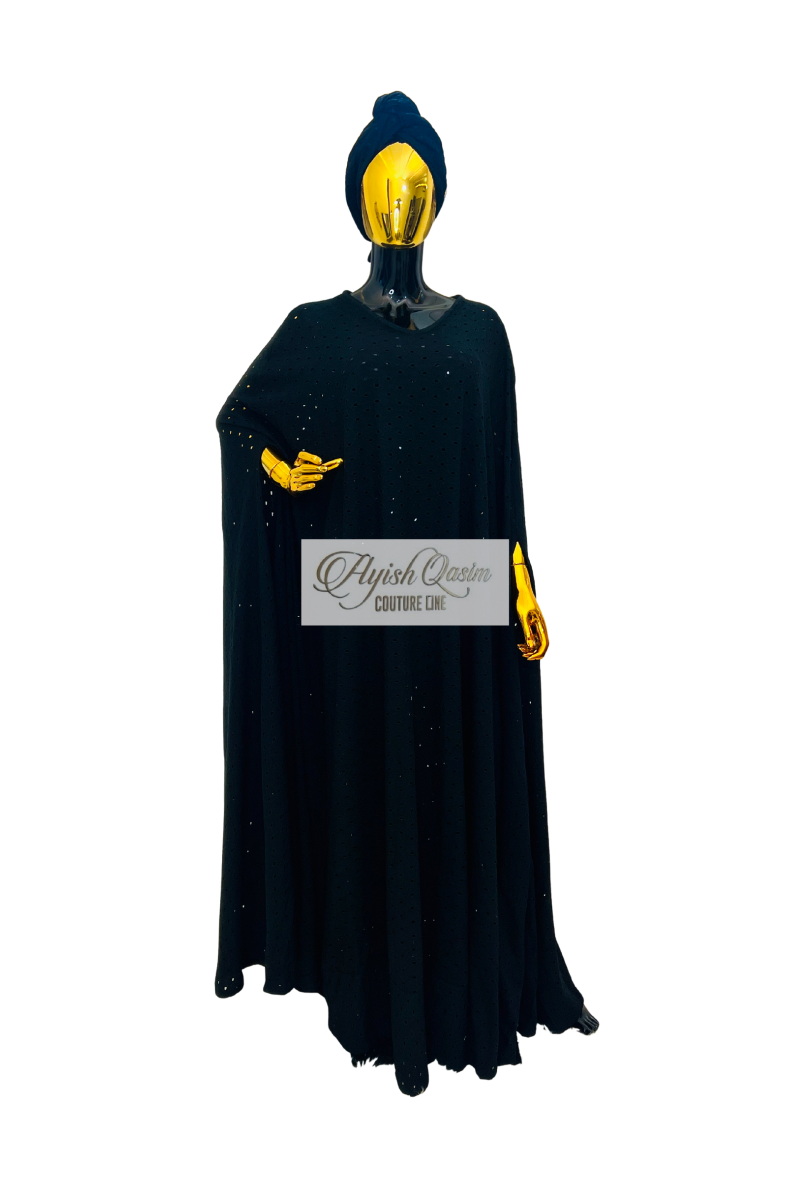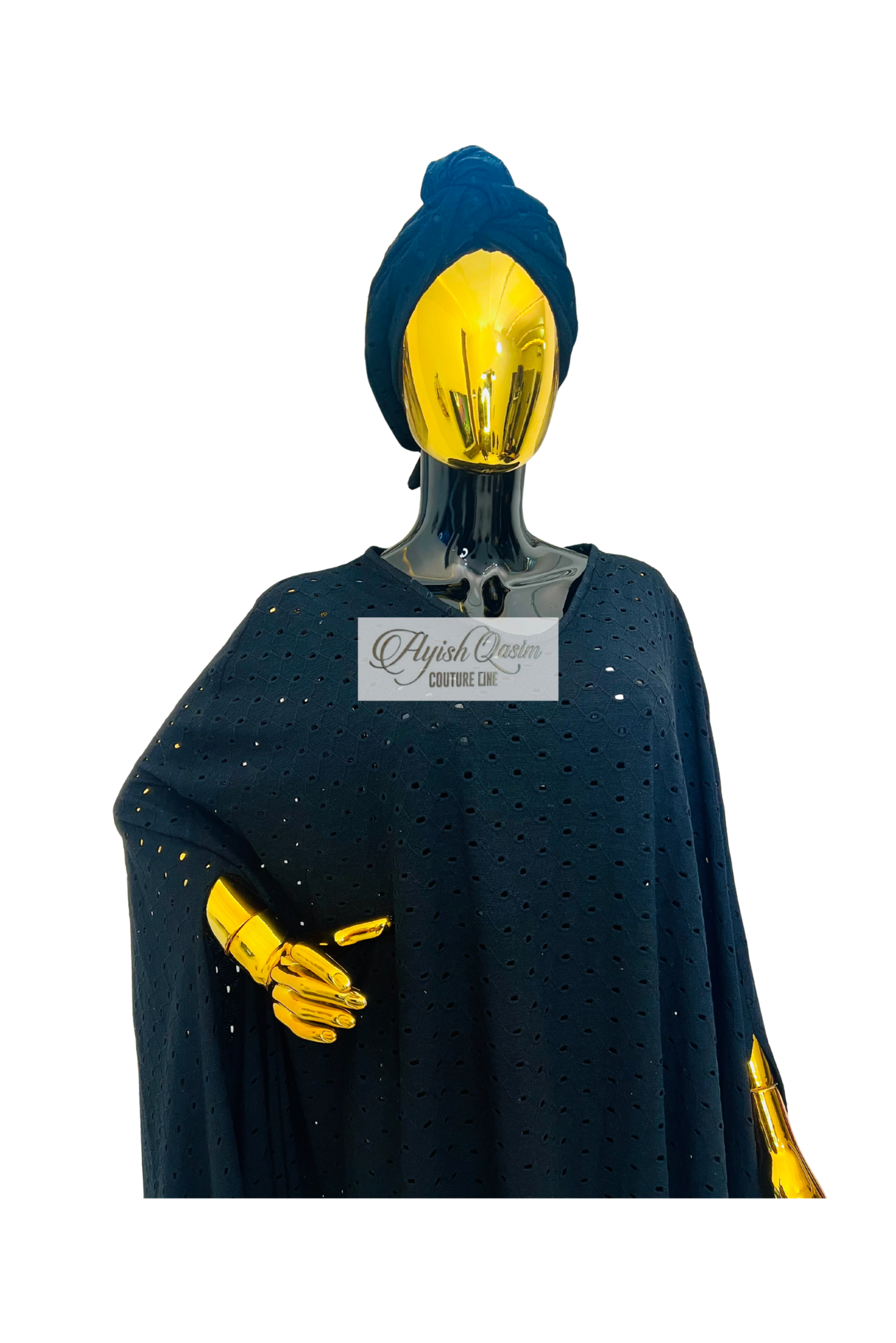 A radiant statement dress in richly textured stretchy lace fabric, designed in a flowing silhouette with a matching headwrap. Bold, luminous, and effortlessly elegant.