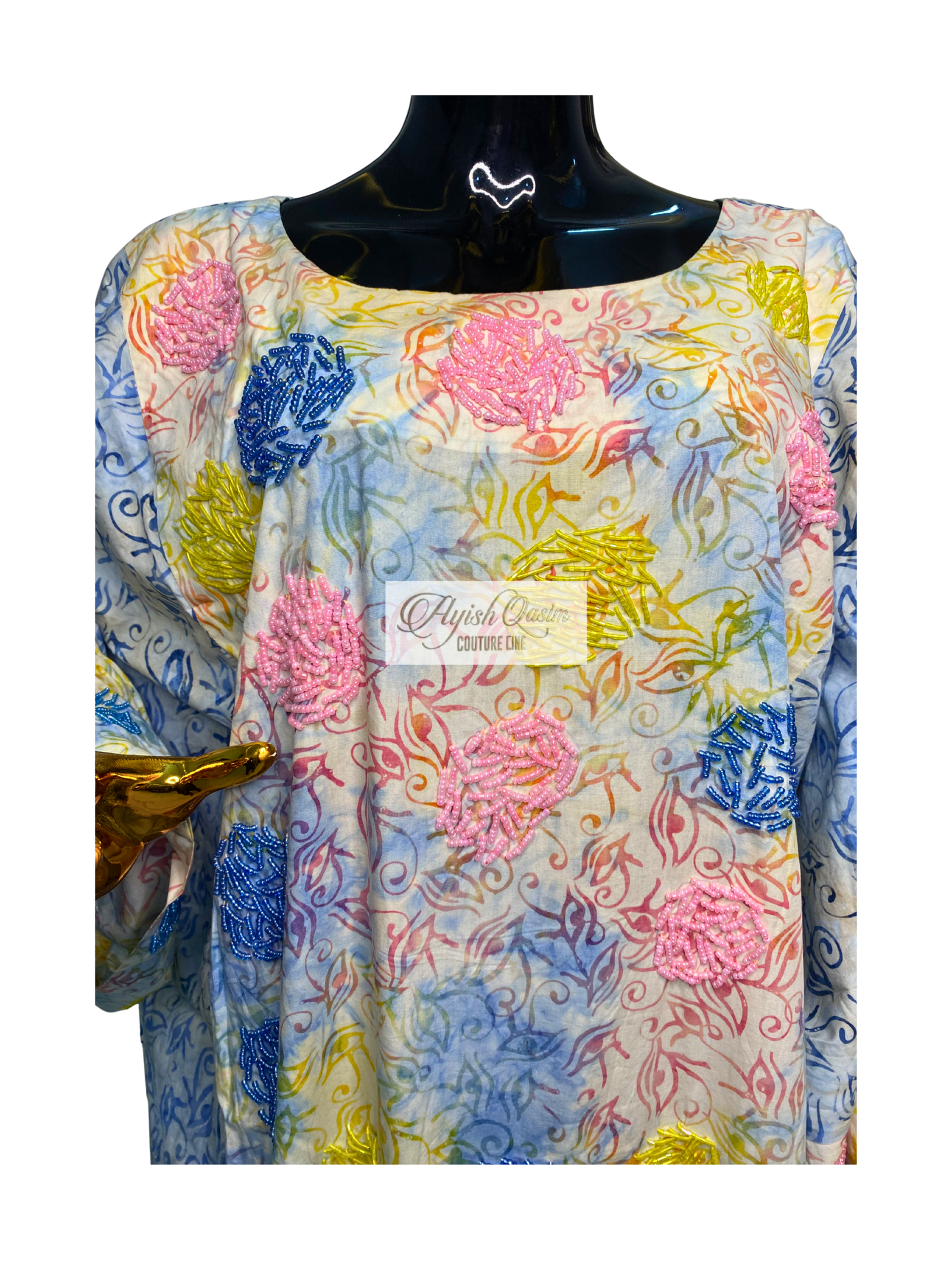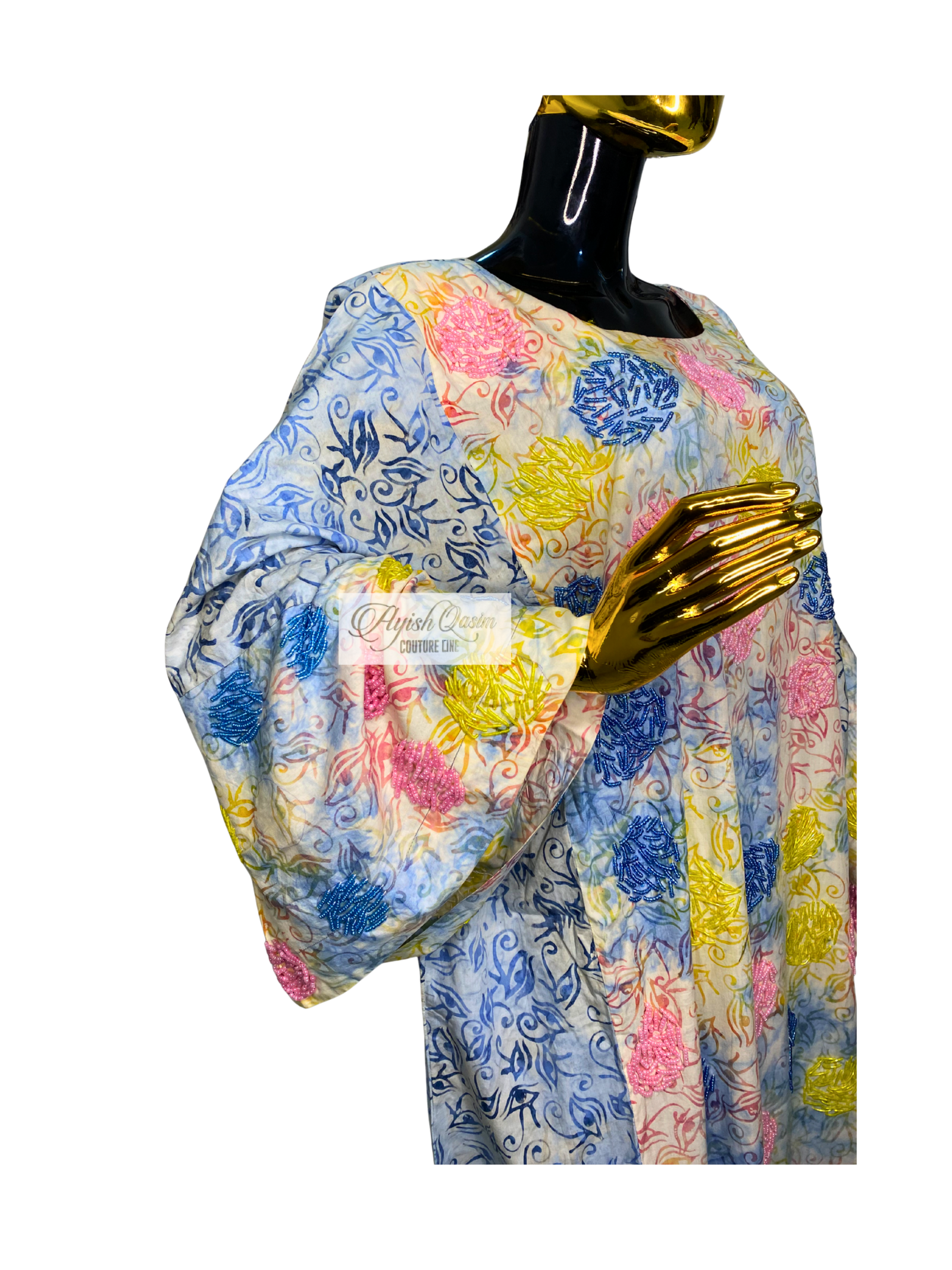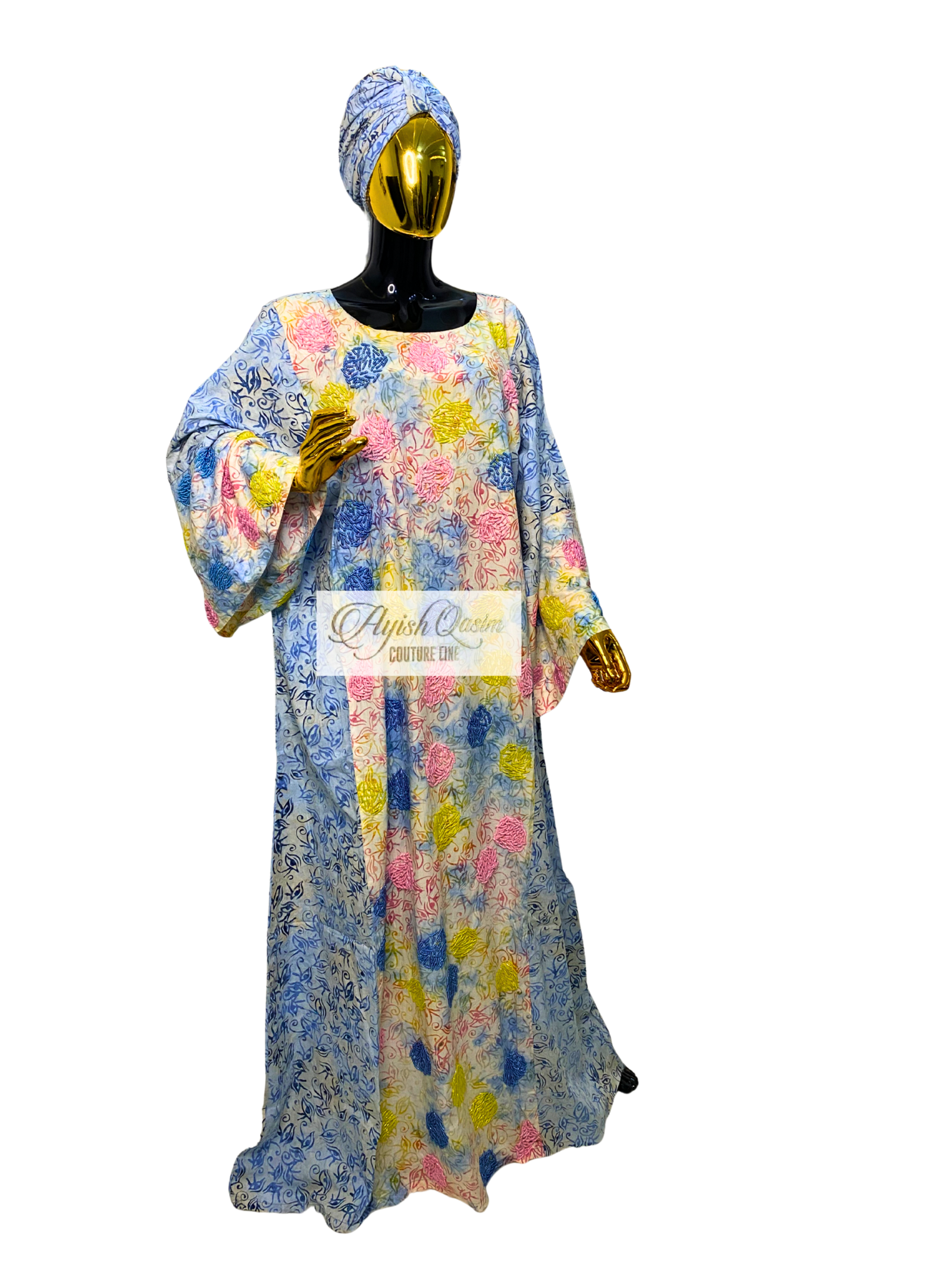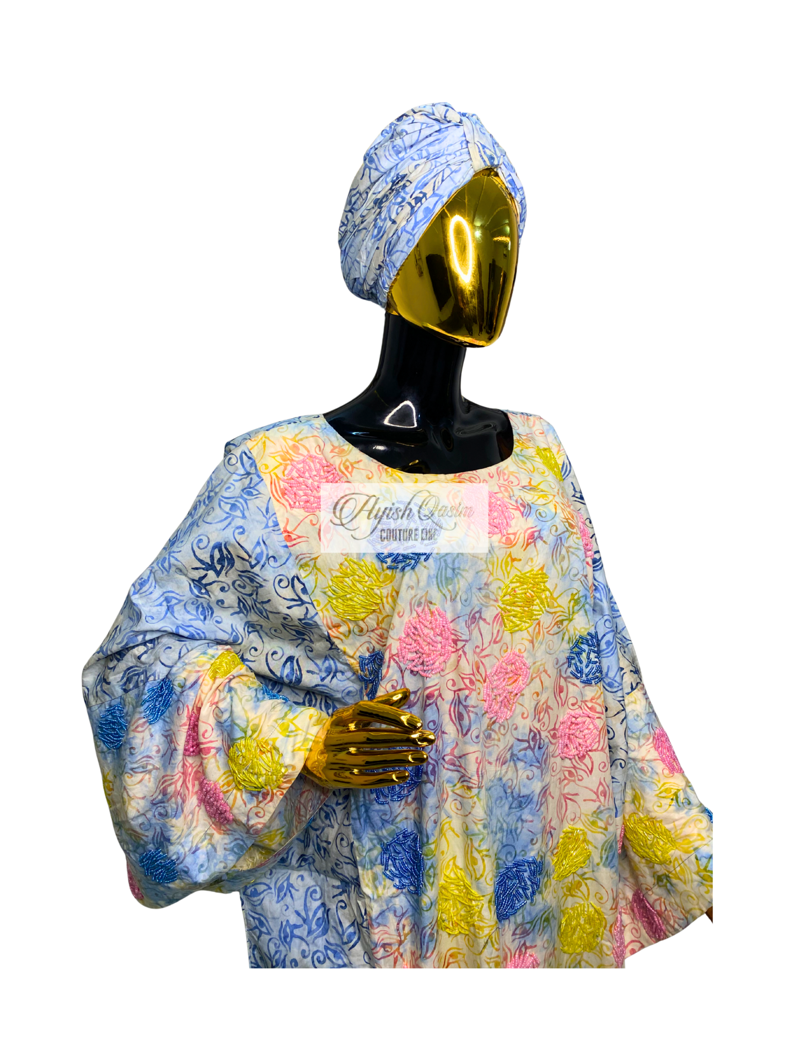 A soft, multicolored dress brought to life with delicate pastel tones and textured floral embellishments that add depth and charm. The airy fabric drapes effortlessly in a relaxed silhouette, complemented by voluminous sleeves and a matching headtie. Light, expressive, and graceful, it offers a fresh take on refined elegance.