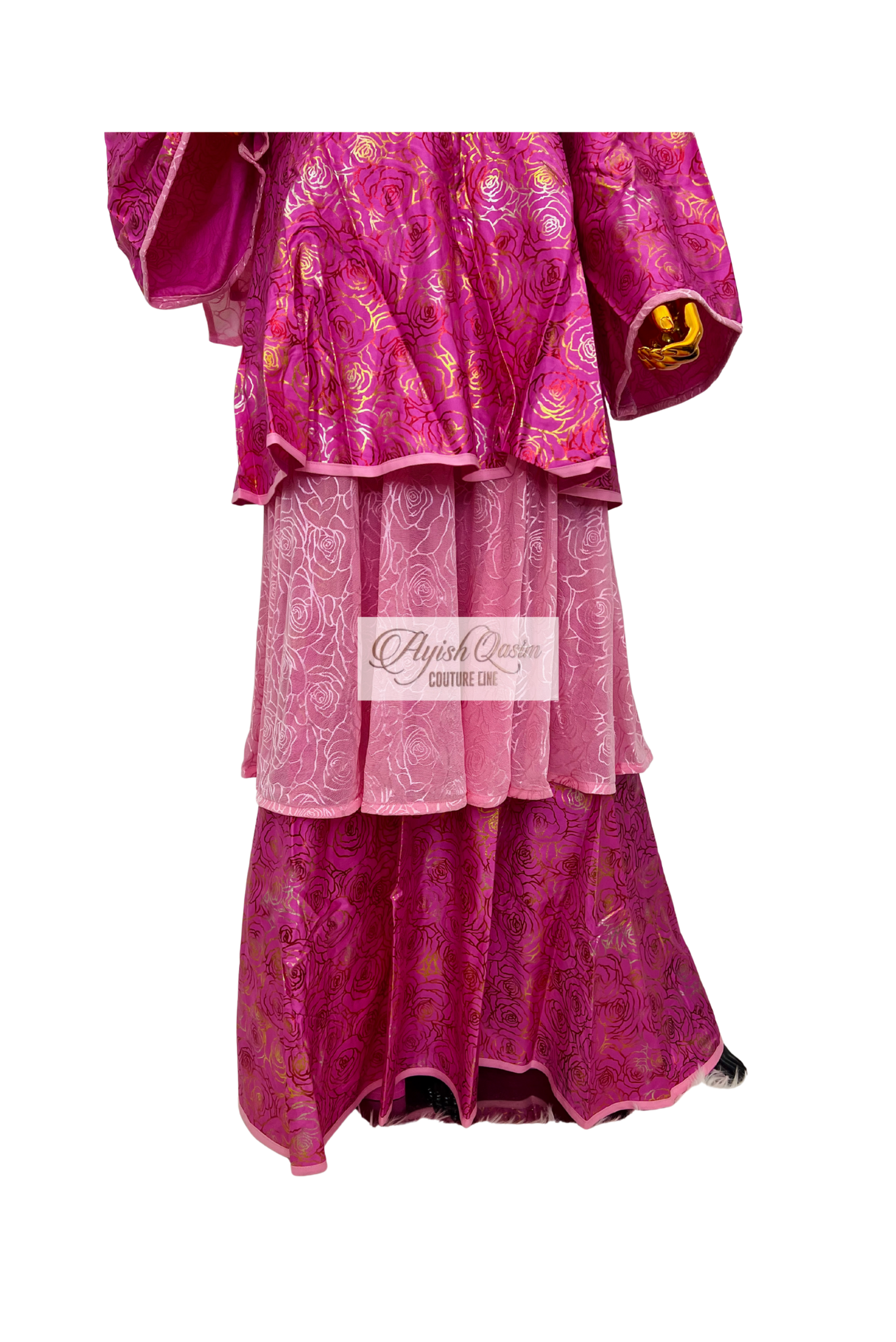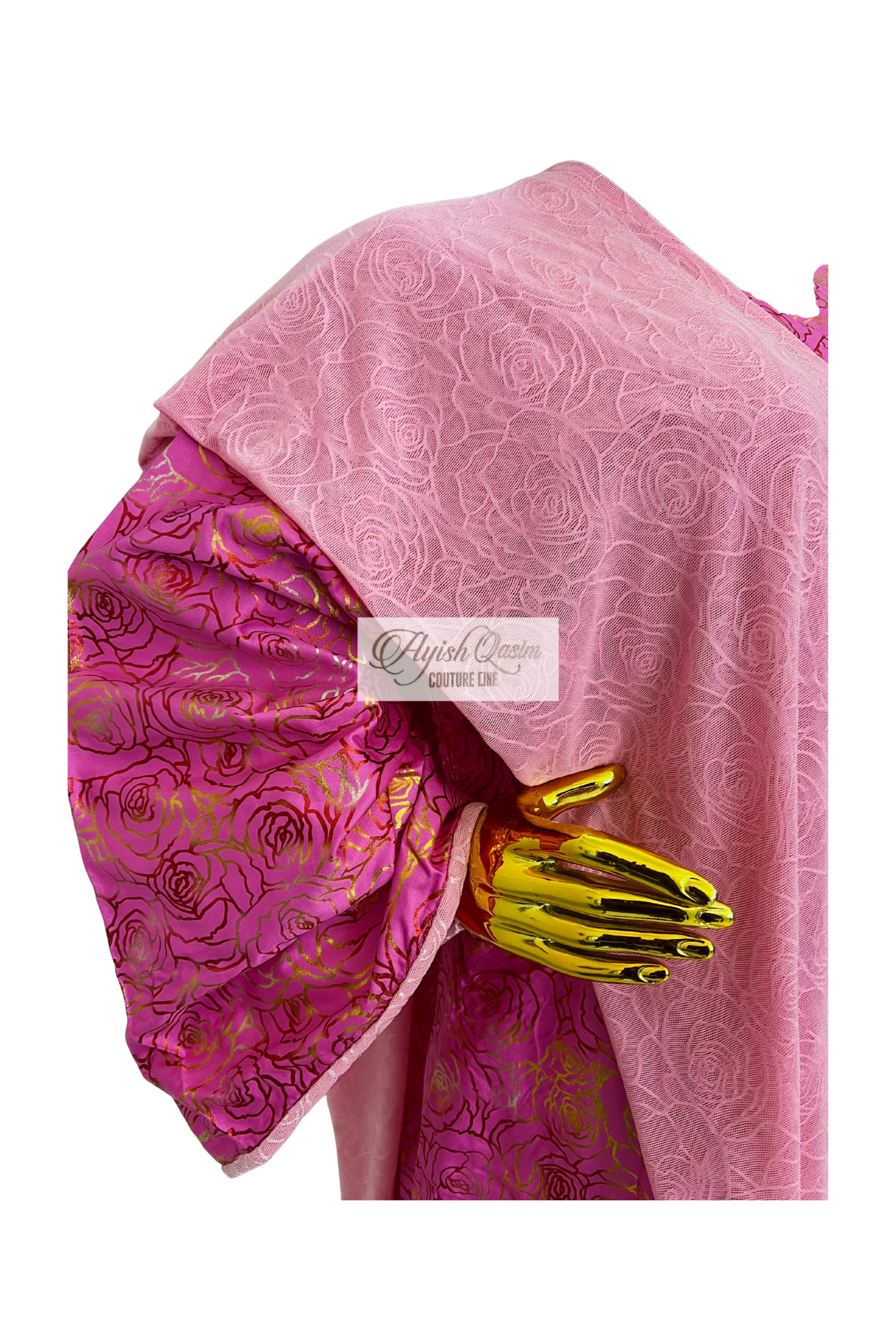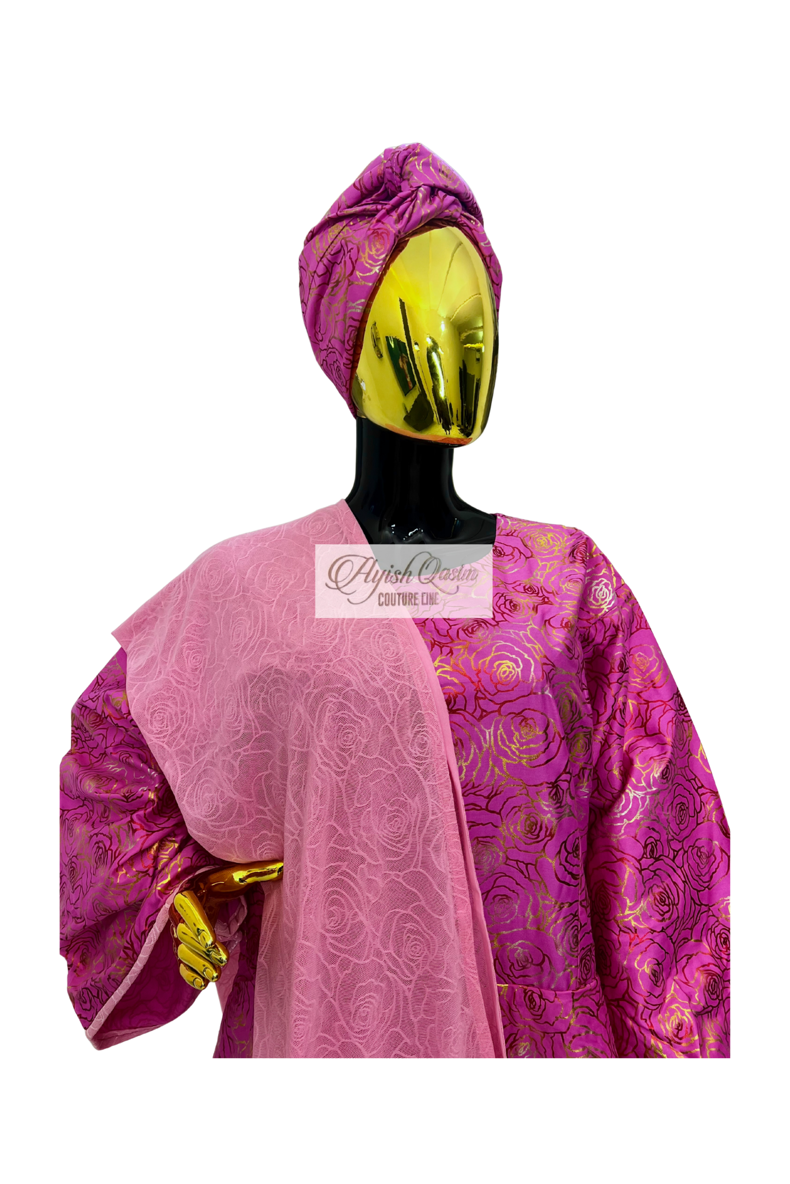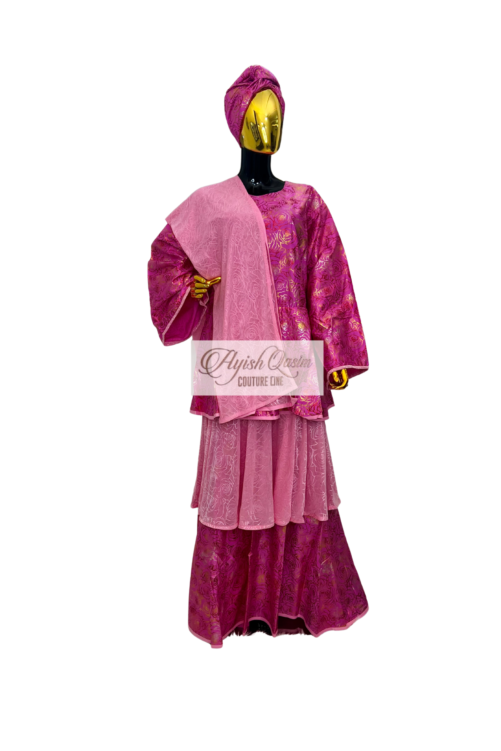 A luxurious blend of ankara and mesh fabric with gold floral patterns. Finished with a matching headwrap, it’s an elegant statement piece that embodies femininity and sophistication.