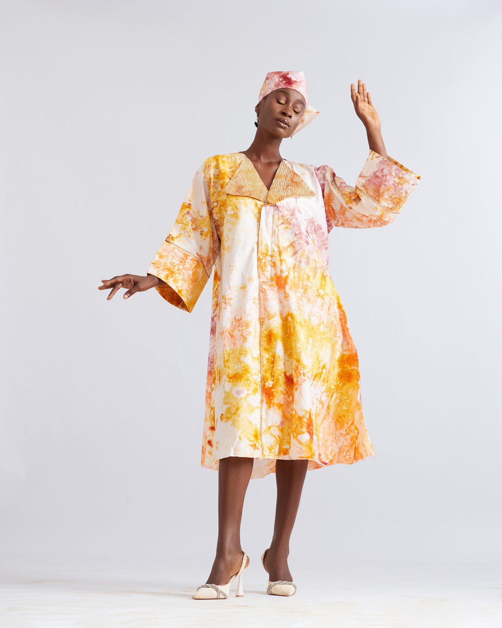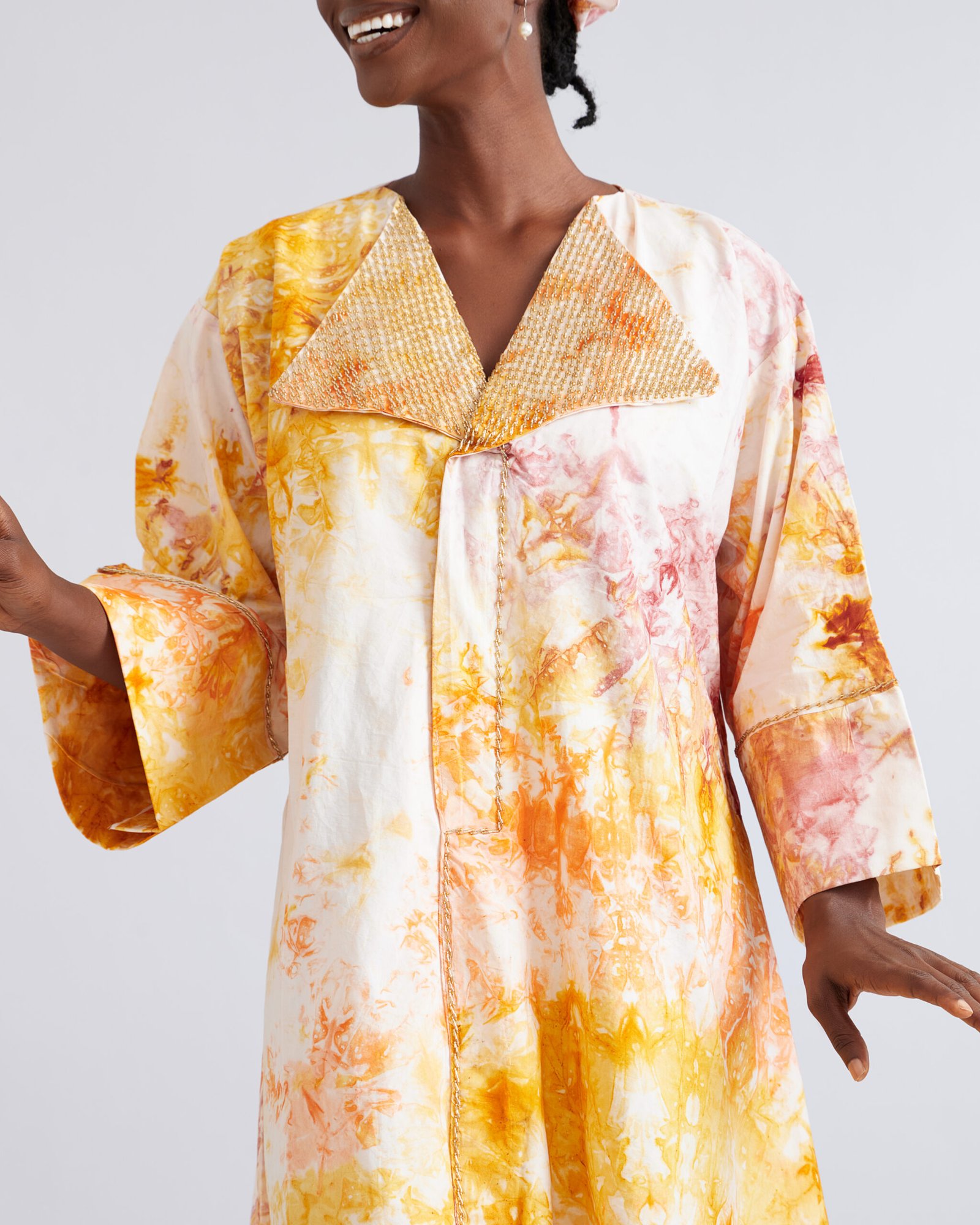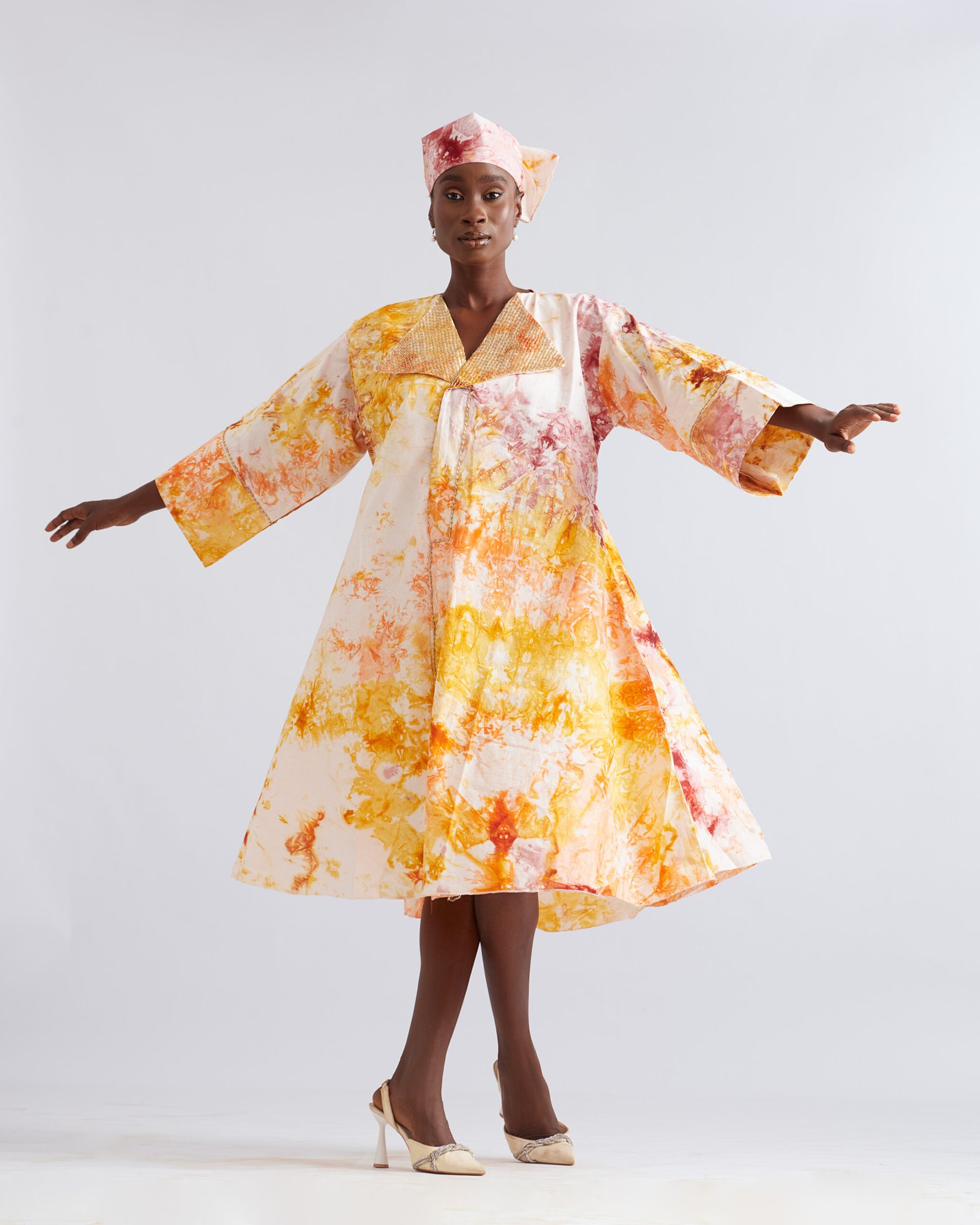 Our Sunlit Harmony Adire Attire brightens any occasion with watercolor-inspired in gold, orange, and blush. Featuring a woven V-neckline, wide sleeves, and a matching headwrap, it’s a perfect balance of culture, comfort, and elegance.