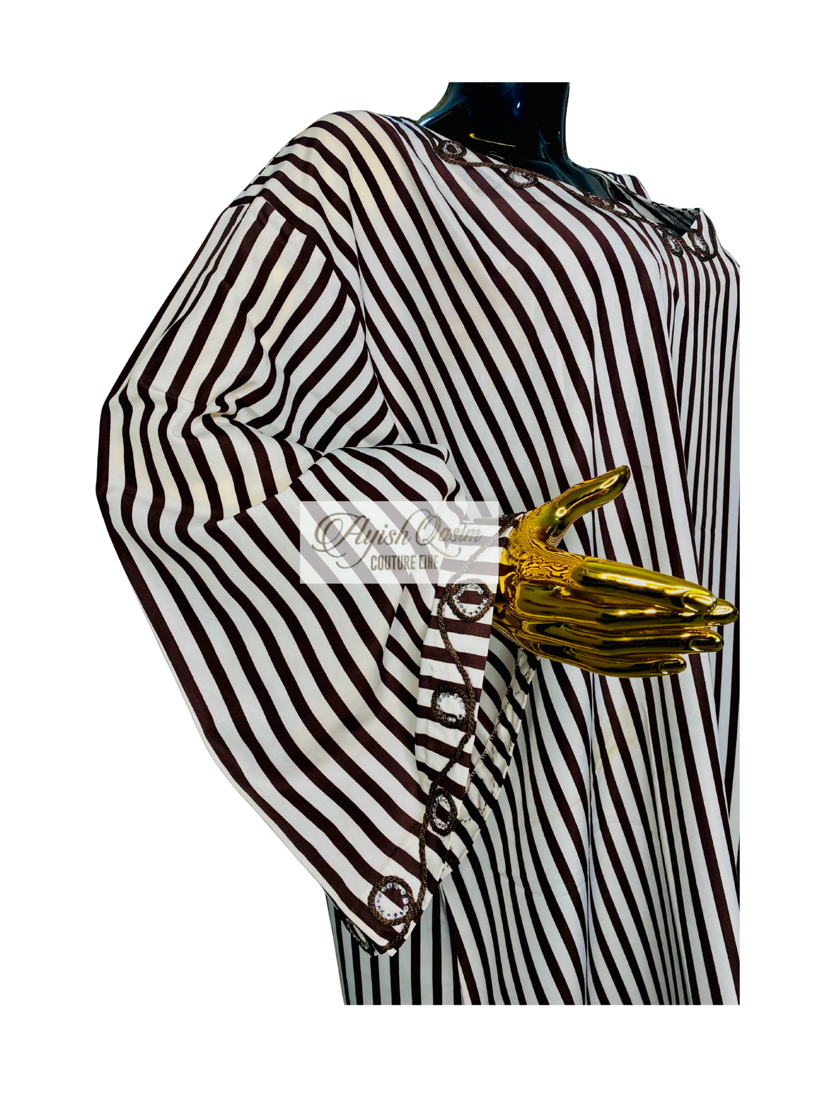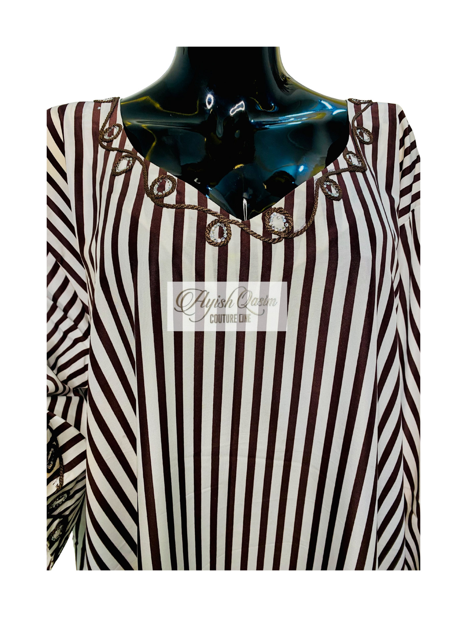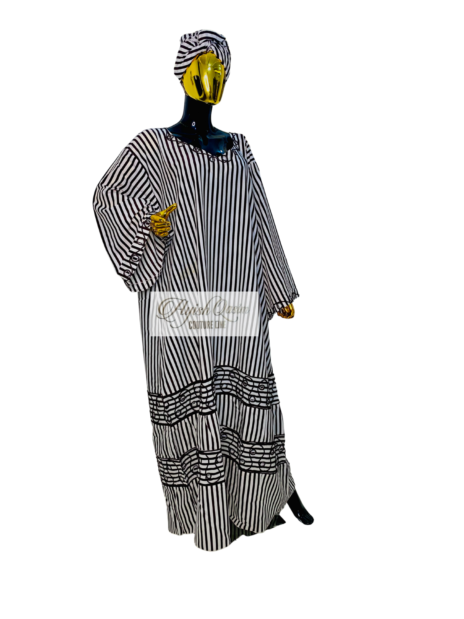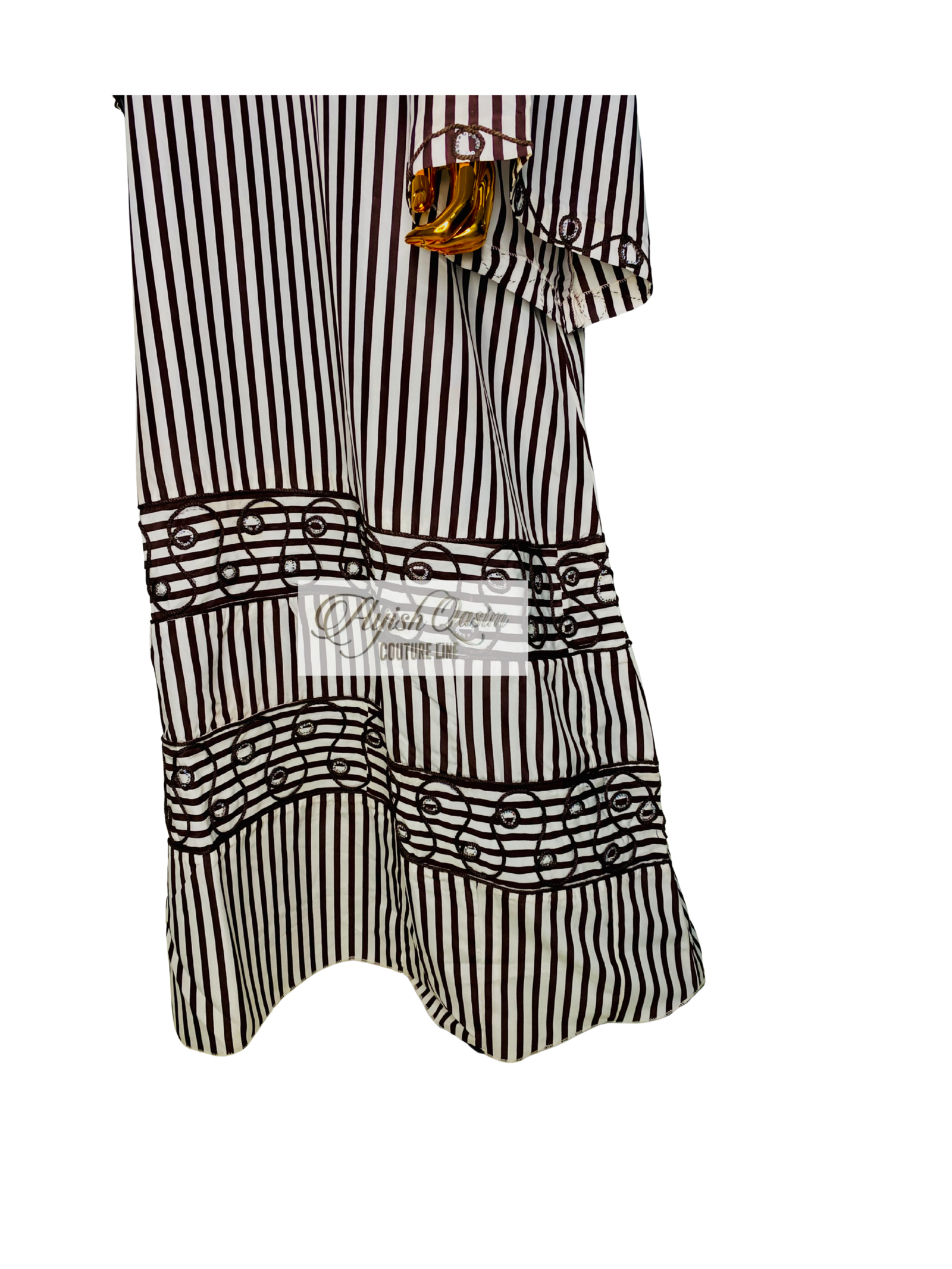 A flowing dress defined by clean brown and white vertical stripes, elevated with subtle embroidered detailing along the neckline, sleeves, and layered hem. Designed in a relaxed, flowing silhouette and paired with a matching headtie, it delivers a warm, grounded elegance with a refined, modern finish.